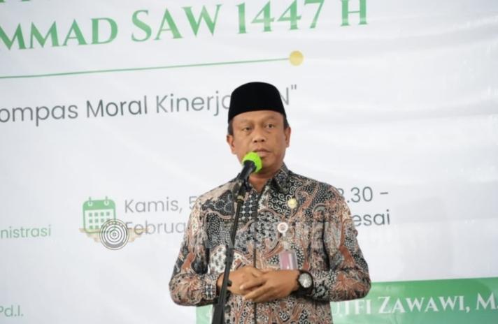 Jakarta Timur, Bidik-kasusnews.com | Walikota Administrasi Jakarta Timur, Munjirin, berharap nilai-nilai luhur peristiwa Isra Miraj Nabi Muhammad SAW dapat direfleksikan dalam kehidupan sehari-hari sebagai upaya membentuk pribadi yang lebih baik, khususnya bagi Aparatur Sipil Negara (ASN) dan Penyedia Jasa Lainnya Perorangan (PJLP). Harapan tersebut disampaikan Munjirin saat menghadiri kegiatan Aktualisasi Nilai-Nilai Isra Miraj Nabi Muhammad SAW 1447 Hijriah yang digelar di Masjid Baitul Muhyi, Kantor Walikota Administrasi Jakarta Timur, Kamis (5/2/2026). Kegiatan ini diikuti oleh ASN dan PJLP di lingkungan Pemerintah Kota Administrasi Jakarta Timur. Mengusung tema “Isra Miraj sebagai Kompas Moral Kinerja ASN”, acara tersebut menghadirkan penceramah KH M Luthfi Zawawi. Dalam sambutannya, Munjirin menekankan bahwa nilai-nilai Isra Miraj tidak hanya relevan diterapkan di lingkungan kerja, tetapi juga dalam kehidupan bermasyarakat. “Saya mengucapkan terima kasih atas terselenggaranya kegiatan Aktualisasi Nilai-Nilai Isra Miraj di lingkungan Pemerintah Kota Administrasi Jakarta Timur. Pelaksanaannya di awal tahun ini sangat tepat, sebagai momentum untuk berhijrah menjadi pribadi yang lebih baik, baik sebagai ASN maupun sebagai anggota masyarakat,” ujar Munjirin. Ia menilai, peristiwa Isra Miraj mengandung pesan moral dan spiritual yang sangat relevan dengan tugas dan tanggung jawab ASN serta PJLP dalam memberikan pelayanan terbaik kepada masyarakat. “Salat mengajarkan kita tentang kedisiplinan waktu, kejujuran, tanggung jawab, serta keikhlasan dalam menjalankan amanah. Nilai-nilai inilah yang harus tercermin dalam kinerja kita sehari-hari,” jelasnya. Lebih lanjut, Munjirin berharap seluruh ASN di Jakarta Timur dapat terus memperkuat keimanan dan ketakwaan kepada Allah SWT serta mengimplementasikan nilai-nilai spiritual tersebut dalam setiap aspek kehidupan dan pekerjaan. “Dengan penguatan nilai keagamaan, kita dapat mewujudkan ASN yang berakhlak mulia, profesional, dan berintegritas,” pungkasnya. Heri Jkt