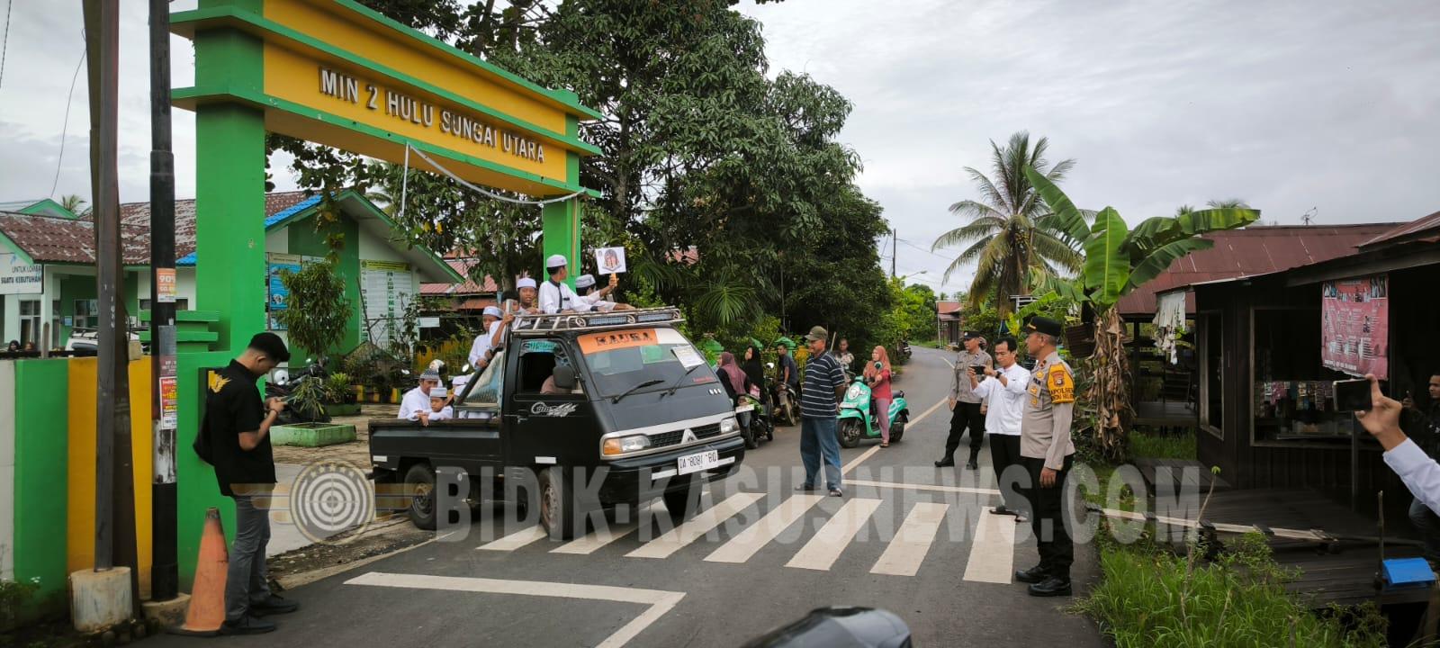 HSU | BIDIK-KASUSNEWS.COM – Jajaran Polsek Amuntai Selatan melaksanakan pengamanan kegiatan Pawai Tarhib Ramadhan 1447 Hijriah yang digelar oleh MIN 2 Hulu Sungai Utara, Jumat (13/2/2026) pagi. Kegiatan berlangsung tertib, aman, dan kondusif berkat sinergi antara kepolisian dan pihak sekolah. Kapolsek Amuntai Selatan bersama anggota turun langsung melakukan pengamanan, didukung personel Sat Lantas Polres Hulu Sungai Utara. Pawai yang dimulai sekitar pukul 08.30 WITA tersebut mengambil titik start di halaman MIN 2 HSU, Desa Simpang Empat, Kecamatan Amuntai Selatan. Sebelum pawai dimulai, pada pukul 08.00 WITA para peserta terlebih dahulu melaksanakan Salat Duha berjamaah dan pembacaan Surah Yasin di mushola sekolah sebagai bentuk kesiapan spiritual dalam menyambut Bulan Suci Ramadhan 1447 H. Sekitar 150 peserta ambil bagian dalam kegiatan ini, terdiri dari kepala madrasah, dewan guru, tenaga kependidikan, serta para siswa. Rombongan menggunakan delapan unit kendaraan roda empat (mobil pick up) yang dihias dengan nuansa islami dan pesan-pesan menyambut Ramadhan. Rute pawai melintasi sejumlah wilayah, yakni Simpang Empat – Panyiruran – Cempaka – Jarang Kuantan – Kotaraja – Jumba – Telaga Silaba – Banyu Hirang – Rukam Hulu – Rukam Hilir, sebelum kembali ke halaman MIN 2 HSU. Selama kegiatan berlangsung, petugas melakukan pengawalan serta pengaturan arus lalu lintas di sejumlah titik persimpangan yang berpotensi menimbulkan kemacetan. Patwal Sat Lantas Polres HSU turut mengawal rombongan guna memastikan keamanan dan kelancaran perjalanan peserta. Sekitar pukul 09.30 WITA, kegiatan pawai selesai dilaksanakan. Secara umum, situasi terpantau aman, tertib, lancar, dan kondusif tanpa adanya gangguan kamtibmas maupun insiden lalu lintas. Pengamanan ini merupakan bagian dari komitmen Polri Presisi dalam memberikan pelayanan terbaik kepada masyarakat, khususnya dalam mendukung kegiatan keagamaan dan pendidikan di wilayah hukum Polsek Amuntai Selatan. (Agus)