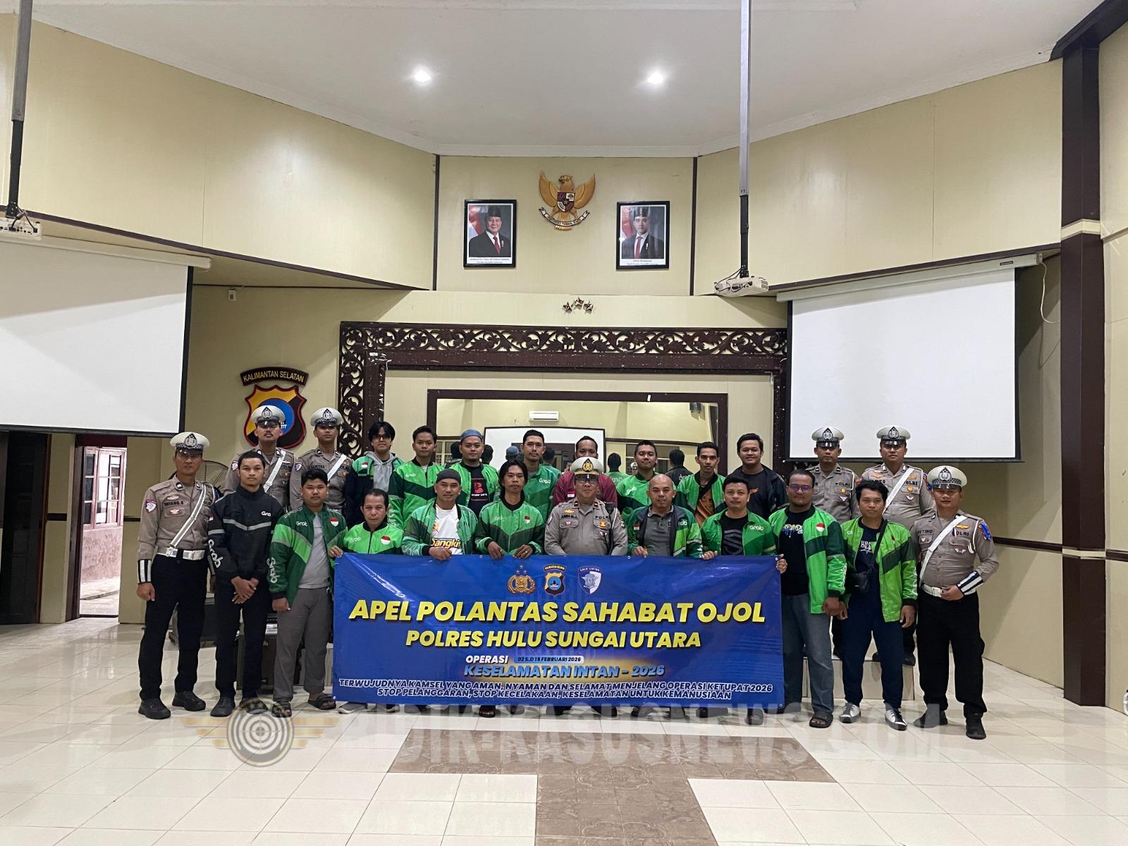 Amuntai, Bidik-kasusnews.com — Satuan Lalu Lintas (Satlantas) Polres Hulu Sungai Utara (HSU) menggelar kegiatan Apel Polantas Sahabat Ojek Online sebagai bagian dari pelaksanaan Operasi Keselamatan Intan 2026, Sabtu (14/2/2026). Kegiatan ini berlangsung di Gedung Jananuraga Polres HSU dan diikuti komunitas pengemudi ojek online (ojol) se-Kabupaten Hulu Sungai Utara. Apel bersama tersebut dipimpin oleh KBO Satlantas Polres HSU, IPDA Amin Mulyadi, S.H., M.A, didampingi para Kanit Satlantas. Kegiatan ini menjadi langkah nyata kepolisian dalam membangun sinergi dengan para pengemudi transportasi daring yang memiliki peran penting dalam mobilitas masyarakat sehari-hari. Dalam arahannya, pimpinan apel menekankan pentingnya kesadaran berlalu lintas sebagai tanggung jawab bersama. Pengemudi ojol diimbau untuk selalu mengutamakan keselamatan, menggunakan helm berstandar SNI, melengkapi surat kendaraan, serta menjaga etika berkendara di jalan raya. Selain penyampaian pesan keselamatan lalu lintas, kegiatan juga diisi dengan sesi diskusi dan tanya jawab. Para pengemudi ojol diberikan kesempatan menyampaikan pengalaman serta kendala di lapangan, sehingga tercipta komunikasi dua arah antara kepolisian dan masyarakat pengguna jalan. Kasat Lantas Polres HSU melalui kegiatan ini menegaskan bahwa apel bersama merupakan upaya preemtif dan preventif untuk menekan angka pelanggaran serta kecelakaan lalu lintas, khususnya selama pelaksanaan Ops Keselamatan Intan 2026. Melalui pendekatan humanis bertajuk Polantas Sahabat Ojek Online, diharapkan tumbuh budaya tertib berlalu lintas di kalangan pengemudi ojol sekaligus mempererat hubungan kemitraan antara kepolisian dan masyarakat. Kegiatan berlangsung dalam suasana tertib, aman, dan lancar. Satlantas Polres HSU berharap kolaborasi ini mampu menciptakan kondisi keamanan, keselamatan, ketertiban, dan kelancaran lalu lintas yang kondusif di wilayah hukum Polres Hulu Sungai Utara. Stop Pelanggaran, Stop Kecelakaan — Keselamatan untuk Kemanusiaan. (Agus)