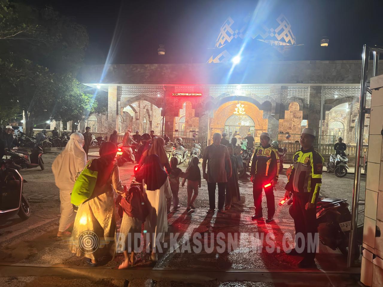 HSU | BIDIK-KASUSNEWS.COM – Untuk memberikan rasa aman dan nyaman bagi masyarakat yang menjalankan ibadah di bulan suci Ramadan, Satuan Lalu Lintas (Satlantas) Polres Hulu Sungai Utara melaksanakan kegiatan pengamanan dan pengaturan arus lalu lintas saat pelaksanaan Shalat Tarawih, Minggu (22/2/2026) malam. Kegiatan yang dimulai sekitar pukul 20.00 WITA tersebut dipusatkan di Masjid Raya At Taqwa, Jalan A. Yani, yang menjadi salah satu lokasi ibadah dengan jumlah jamaah cukup banyak setiap malam Ramadan. Kasat Lantas Polres Hulu Sungai Utara melalui laporan kegiatan menyampaikan bahwa pengamanan dilakukan guna memastikan kelancaran arus kendaraan sekaligus menjaga keamanan jamaah selama berlangsungnya ibadah. Personel yang ditugaskan dalam kegiatan tersebut yakni BRIPKA Osman, S.Sos., BRIGPOL Widianto, dan BRIPDA Muhammad Rudrigo H. Mereka melaksanakan pengaturan arus kendaraan di sekitar area masjid serta membantu penyeberangan jamaah guna mencegah potensi kemacetan maupun kecelakaan lalu lintas. Selain melakukan pengaturan kendaraan, petugas juga melakukan pemantauan situasi keamanan di sekitar lokasi ibadah agar masyarakat dapat melaksanakan Shalat Tarawih dengan khusyuk dan tanpa gangguan. Dari hasil pelaksanaan kegiatan, situasi terpantau aman, tertib, dan terkendali. Arus lalu lintas di sekitar masjid berjalan lancar, sementara pelaksanaan ibadah berlangsung kondusif hingga selesai. Kegiatan ini merupakan bagian dari komitmen Polres Hulu Sungai Utara dalam memberikan pelayanan kepada masyarakat, khususnya selama bulan Ramadan, melalui kehadiran polisi di tengah aktivitas keagamaan. Satlantas Polres HSU juga terus mengimbau masyarakat untuk selalu mematuhi aturan lalu lintas demi keselamatan bersama, sejalan dengan slogan “Stop Pelanggaran, Stop Kecelakaan, Keselamatan untuk Kemanusiaan (Safety for Humanity).” (Agus)