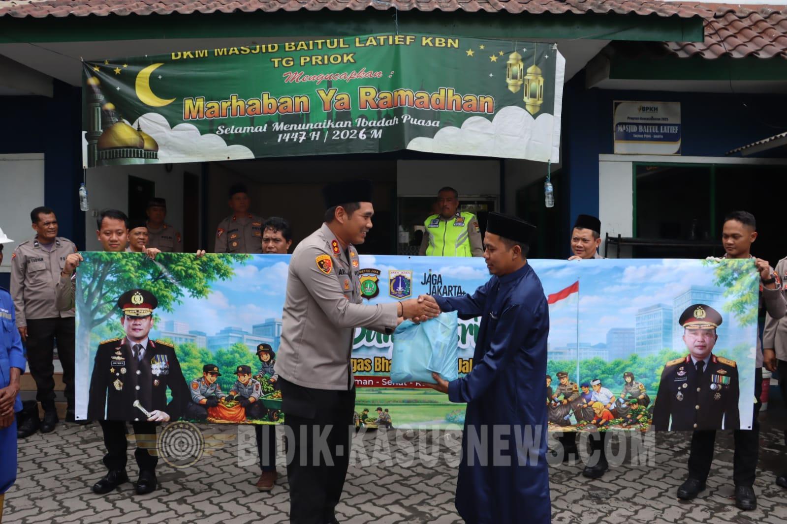 Jakarta Utara, Bidik-kasusnews.com – Satuan Tugas Bhayangkara Jakarta Asri (Bang Jasri) Polres Pelabuhan Tanjung Priok melaksanakan kegiatan kerja bakti membersihkan Masjid Baitul Latief KBN Pelabuhan Tanjung Priok, Senin (23/2/2026) sore. Kegiatan ini merupakan wujud kepedulian Polri terhadap kebersihan tempat ibadah sekaligus mempererat sinergitas dengan masyarakat di bulan suci Ramadhan 1447 Hijriah. Kegiatan tersebut dipimpin langsung oleh Kapolres Pelabuhan Tanjung Priok, AKBP Aris Wibowo, S.I.K., M.H., didampingi Wakapolres Kompol Yudi Permadi, S.S., S.I.K., para Pejabat Utama (PJU), serta diikuti oleh 60 personel Polres Pelabuhan Tanjung Priok. Rangkaian kegiatan diawali dengan pelaksanaan Sholat Ashar berjamaah di Masjid Baitul Latief. Selanjutnya Personel Polres Pelabuhan Tanjung Priok melaksanakan kerja bakti dengan membersihkan area dalam dan sekitar masjid, termasuk halaman dan fasilitas umum lainnya. Tidak hanya melakukan aksi bersih-bersih, juga dilaksanakan pembagian bantuan sembako kepada marbot masjid dan masyarakat sekitar sebagai bentuk kepedulian sosial Polri terhadap marbot masjid serta masyarakat di lingkungan Pelabuhan Tanjung Priok. Kapolres Pelabuhan Tanjung Priok, AKBP Aris Wibowo, menyampaikan bahwa kegiatan ini merupakan bagian dari program Satgas Bhayangkara Jakarta Asri yang bertujuan membangun budaya peduli lingkungan serta memperkuat hubungan harmonis antara Polri dan masyarakat. “Kegiatan ini tidak hanya bertujuan menjaga kebersihan tempat ibadah, tetapi juga sebagai sarana mempererat silaturahmi dan sinergi antara Polri dengan pengurus masjid serta masyarakat pelabuhan. Kami berharap suasana ibadah selama Ramadhan 1447 H dapat berlangsung aman, nyaman, dan kondusif,” ujarnya. Melalui kegiatan ini, Polres Pelabuhan Tanjung Priok menunjukkan komitmennya dalam menghadirkan Polri yang humanis, peduli, dan selalu hadir di tengah masyarakat, khususnya dalam mendukung terciptanya lingkungan yang bersih dan suasana kamtibmas yang kondusif