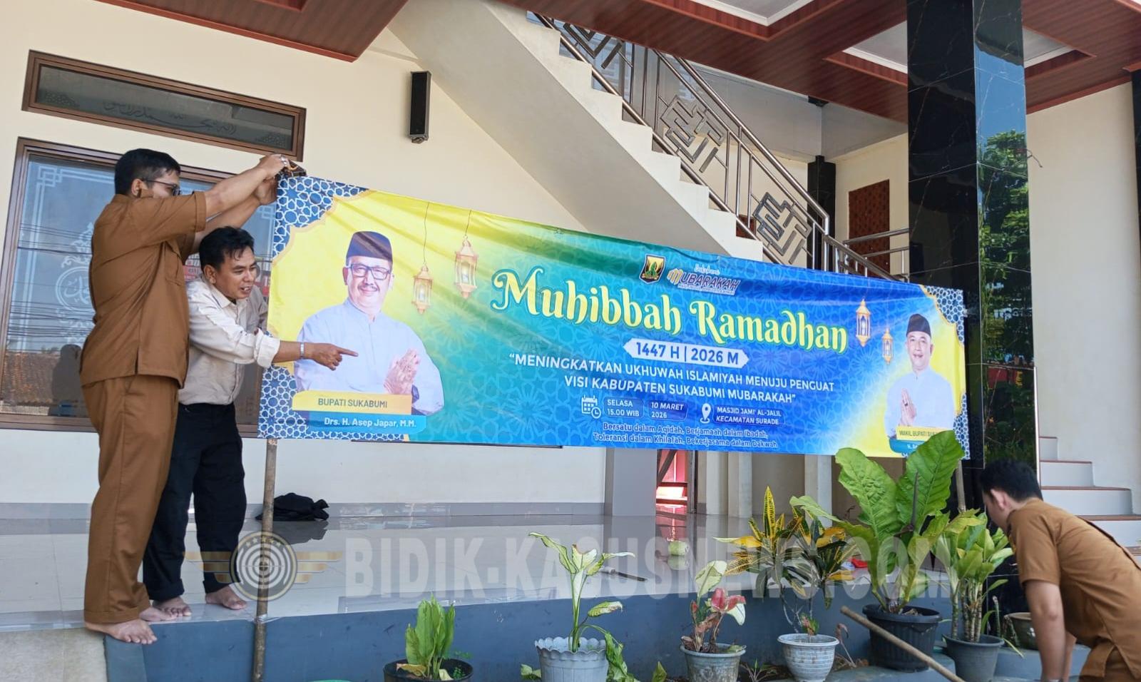 SUKABUMI-BIDIK-KASUSNEWS.COM – Satuan Polisi Pamong Praja (Satpol PP) Kecamatan Surade, Kabupaten Sukabumi, memasang baliho Muhibah Ramadan 1447 Hijriah/2026 Masehi di area Masjid Al-Jalil, Bundaran Surade, Senin (9/3/2026). Pemasangan baliho tersebut dilakukan sebagai bentuk syiar sekaligus upaya mempererat ukhuwah Islamiah di tengah masyarakat menjelang dan selama bulan suci Ramadan. Kegiatan ini juga menjadi bagian dari upaya menciptakan lingkungan yang lebih tertib, bersih, dan bernuansa religius di kawasan pusat Kecamatan Surade. Proses pemasangan baliho dilakukan oleh anggota Satpol PP Kecamatan Surade bersama pengurus Masjid Al-Jalil serta masyarakat sekitar. Kasi Trantib Kecamatan Surade, H. Rimbayana mengatakan, keberadaan baliho tersebut diharapkan dapat menambah semangat masyarakat dalam menyambut bulan suci Ramadan sekaligus memperkuat nilai kebersamaan. Menurutnya, pesan yang disampaikan dalam baliho tersebut mengajak masyarakat untuk memperkuat persaudaraan serta meningkatkan kualitas ibadah selama Ramadan. “Kami berharap keberadaan baliho ini dapat menghadirkan suasana Ramadan yang lebih khidmat sekaligus mempererat ukhuwah Islamiah di tengah masyarakat,” ujarnya. Ia menambahkan, kegiatan tersebut juga merupakan bagian dari dukungan terhadap visi Kabupaten Sukabumi Mubarokah, yakni Maju, Unggul, Berbudaya, dan Berkah. Melalui semangat kebersamaan dengan slogan “Bersatu dalam aqidah, berjamaah dalam ibadah, toleransi dalam khilafiyah, serta bekerja sama dalam dakwah”, masyarakat diharapkan terus menjaga kerukunan sekaligus menciptakan lingkungan yang tertib, bersih, dan harmonis selama Ramadan. (Dicky)