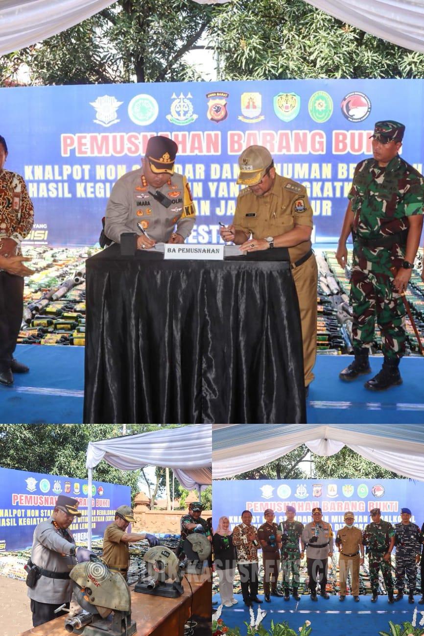 Cirebon,Bidik-kasusnews.com,.Polresta Cirebon memusnahkan ribuan barang bukti minuman keras (miras) dan knalpot tidak sesuai spesifikasi teknis hasil Kegiatan Rutin Yang Ditingkatkan (KRYD) dan Operasi Pekat menjelang pelaksanaan Operasi Ketupat Lodaya 2026 serta pengamanan perayaan Idul Fitri 1447 H. Kegiatan pemusnahan tersebut dilaksanakan pada Kamis (12/3/2026) di Lapangan Stadion Ranggajati Sumber, Kecamatan Sumber, Kabupaten Cirebon. Kegiatan dipimpin langsung oleh Kapolresta Cirebon Kombes Pol Imara Utama, S.H., S.I.K., M.H. Turut hadir dalam kegiatan tersebut Bupati Cirebon Drs. H. Imron, M.Ag., Wakapolresta Cirebon AKBP Eko Munarianto, S.I.K., M.H., Dandim 0620/Kabupaten Cirebon Letkol Inf. Nizar Bachtiar, S.H., M.IP., Ketua MUI Kabupaten Cirebon KH. Zam Zami Amien, perwakilan Kejaksaan Negeri Sumber, perwakilan Pengadilan Negeri Sumber, para pejabat utama Polresta Cirebon, para Kapolsek jajaran, unsur perangkat daerah Kabupaten Cirebon, serta awak media. Kapolresta Cirebon Kombes Pol Imara Utama mengatakan, pemusnahan barang bukti tersebut merupakan hasil penindakan dari Operasi Pekat dan KRYD yang dilaksanakan sejak Januari hingga Maret 2026. Pemusnahan dilakukan berdasarkan keputusan Pengadilan Negeri Sumber. “Pemusnahan barang bukti ini merupakan hasil dari Operasi Pekat yang dilaksanakan sejak Januari hingga Maret 2026. Seluruh barang bukti dimusnahkan berdasarkan putusan Pengadilan Negeri Sumber sebagai bentuk komitmen kami dalam memberantas peredaran miras serta penggunaan knalpot tidak sesuai spesifikasi teknis di wilayah hukum Polresta Cirebon,” ujar Kapolresta Cirebon. Ia menegaskan, langkah tersebut merupakan bagian dari upaya Polresta Cirebon untuk menciptakan situasi kamtibmas yang aman dan kondusif selama bulan suci Ramadhan hingga menjelang perayaan Idul Fitri. “Kami ingin memastikan masyarakat dapat menjalankan ibadah puasa dengan aman, nyaman, dan khusyuk tanpa gangguan dari peredaran miras maupun penggunaan knalpot brong yang meresahkan masyarakat,” katanya. Sementara itu, Bupati Cirebon Drs. H. Imron, M.Ag., mengapresiasi langkah Polresta Cirebon dalam memberantas peredaran minuman keras dan knalpot brong yang dinilai sering menimbulkan gangguan ketertiban masyarakat. Ia menilai masih banyak permasalahan sosial yang dipicu oleh konsumsi minuman keras sehingga diperlukan upaya bersama untuk menekan peredarannya. “Kami mengucapkan terima kasih kepada Polresta Cirebon yang telah bekerja keras melakukan razia miras dan knalpot brong. Diharapkan upaya ini dapat menekan peredarannya sehingga situasi di Kabupaten Cirebon tetap aman dan kondusif,” ujarnya. Dalam kegiatan tersebut, barang bukti yang dimusnahkan di antaranya minuman keras pabrikan berbagai merek sebanyak 2.673 botol, minuman keras tradisional jenis ciu sebanyak 7.010 botol, minuman keras tradisional jenis tuak sebanyak 469 liter, serta knalpot tidak sesuai spesifikasi teknis sebanyak 2.633 buah. Seluruh barang bukti tersebut merupakan hasil penindakan Polresta Cirebon dan jajaran dalam pelaksanaan KRYD serta Operasi Pekat yang digelar untuk menjaga situasi keamanan dan ketertiban masyarakat menjelang pelaksanaan Operasi Ketupat Lodaya 2026 dan pengamanan Hari Raya Idul Fitri 1447 H di wilayah hukum Polresta Cirebon. (Asep Rusliman)