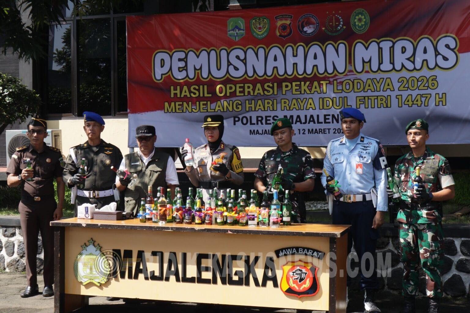 Majalengka,Bidik-kasusnews.com,.Segera setelah pelaksanaan Apel Gelar Pasukan Operasi Ketupat Lodaya 2026, Polres Majalengka melanjutkan agenda penting berupa pemusnahan ribuan botol minuman keras (miras) berbagai merk di halaman Mapolres Majalengka pada Kamis (12/3/2026). Kegiatan ini dipimpin langsung oleh Kapolres Majalengka AKBP Rita Suwadi, S.H., S.I.K., M.M., dengan didampingi oleh Bupati Majalengka Drs. H. Eman Suherman, M.M., Dandim 0617/Majalengka Letkol Inf. Fahmi Guruh Rahayu, S.I.P., M.I.P., serta unsur Forkopimda Kabupaten Majalengka lainnya yang turut hadir dalam rangkaian acara tersebut. Kapolres Majalengka AKBP Rita Suwadi, S.H., S.I.K., M.M., melalui Kasat Reserse Narkoba AKP Sigit Purnomo, S.H., menjelaskan bahwa seluruh barang bukti yang dimusnahkan merupakan hasil dari Operasi Penyakit Masyarakat (Pekat) Lodaya 2026 yang dilaksanakan secara intensif menjelang Hari Raya Idulfitri 1447 H. Operasi ini menyasar para penjual miras serta jamu tradisional tanpa izin edar yang beroperasi di kios-kios maupun warung di seluruh wilayah Kabupaten Majalengka. Langkah tegas ini diambil untuk meminimalisir gangguan kamtibmas yang kerap dipicu oleh konsumsi alkohol, sekaligus memastikan kekhusyukan masyarakat dalam beribadah di penghujung bulan suci Ramadan. Adapun jumlah total barang bukti yang dimusnahkan mencapai 4.281 botol minuman keras. Jumlah tersebut terdiri dari 4.031 botol miras pabrikan berbagai merk serta 250 botol minuman keras tradisional jenis ciu dan arak. Keberhasilan penyitaan ini merupakan hasil kerja keras kolektif dari Sat Res Narkoba yang menyita 3.120 botol miras pabrikan dan 129 botol ciu, Sat Samapta sebanyak 350 botol miras pabrikan, serta kontribusi Polsek jajaran yang berhasil mengamankan 561 botol miras pabrikan dan 121 botol ciu dari berbagai titik di wilayah hukum Polres Majalengka. Pemusnahan ini menjadi peringatan keras bagi para pelaku peredaran miras ilegal di Majalengka. Secara hukum, para pelaku telah melanggar Pasal 9 Peraturan Daerah Kabupaten Majalengka Nomor 06 Tahun 2011 tentang larangan, pengawasan, pengedaran, dan penjualan minuman beralkohol. Pelanggaran tersebut dikategorikan sebagai tindak pidana ringan dengan ancaman hukuman kurungan paling lama tiga bulan atau denda maksimal sebesar Rp5.000.000. Dengan pemusnahan ini, Polres Majalengka menegaskan komitmennya untuk terus memberantas peredaran miras demi mewujudkan situasi daerah yang aman, nyaman, dan kondusif bagi seluruh lapisan masyarakat. (Asep Rusliman)