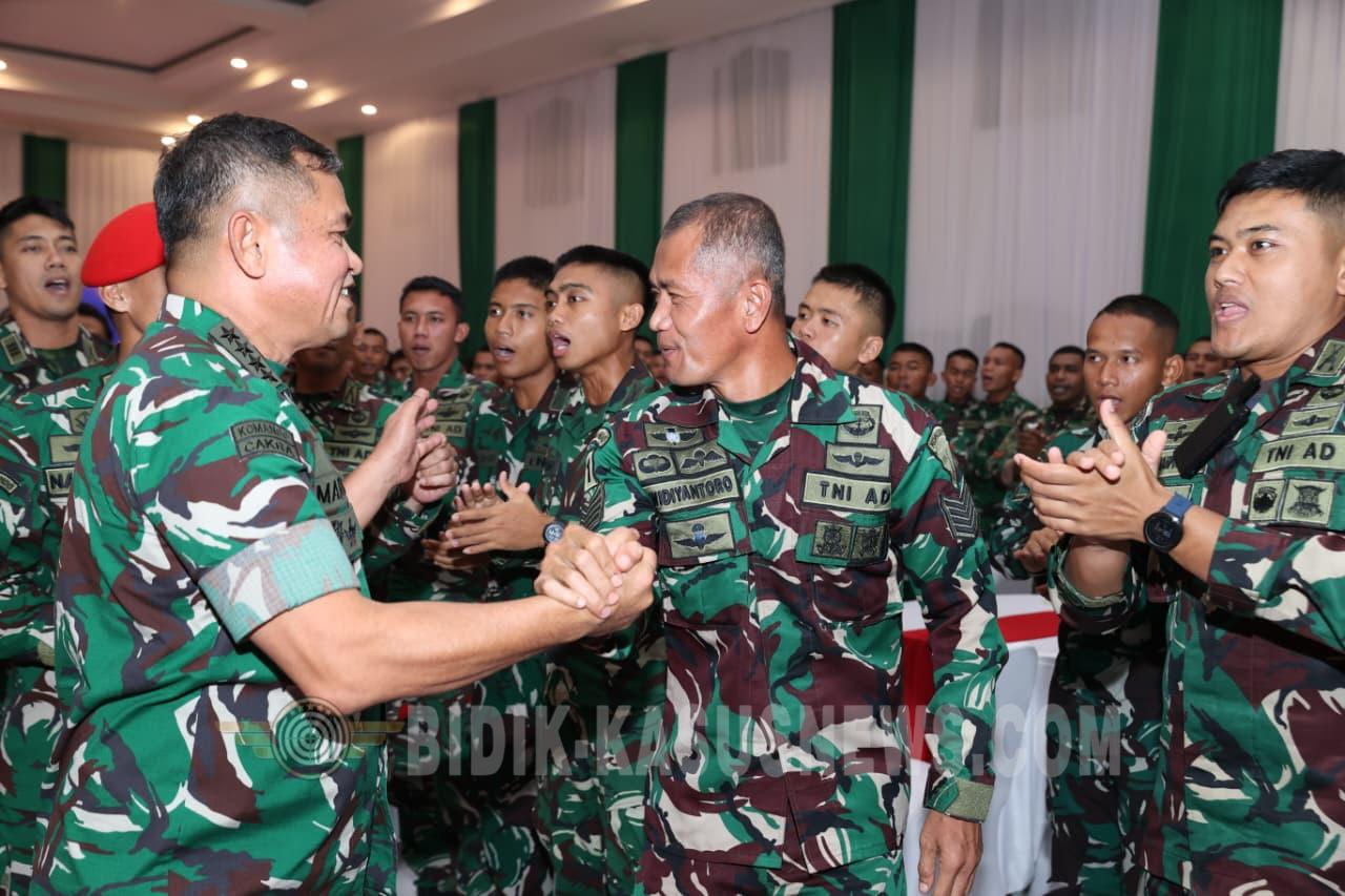 BIDIK-KASUSNEWS.COM SERANG – Kepala Staf Angkatan Darat Jenderal TNI Maruli Simanjuntak, M.Sc. menegaskan bahwa pembinaan prajurit untuk membentuk karakter yang kuat, disiplin, dan pantang menyerah harus berjalan seiring dengan pembinaan keagamaan. Hal tersebut disampaikannya saat menghadiri kegiatan buka puasa bersama prajurit dan keluarga besar Grup 1 Kopassus di Markas Grup 1 Kopassus, Serang, Banten, Senin (16/3/2026). Menurut Kasad, kegiatan keagamaan di lingkungan satuan memiliki peran penting dalam membentuk kepribadian prajurit, sekaligus menjadi landasan moral dalam pelaksanaan tugas. “Itu harus terus dilakukan. Anda tidak bisa membina anggota anda menjadi baik tanpa pendampingan keagamaan yang baik,” ujar Kasad. Selain itu, Kasad juga mengingatkan para prajurit agar terus membangun kualitas diri sebagai prajurit yang tangguh dan siap menghadapi dinamika tugas yang semakin beragam. “Anda harus membentuk diri anda menjadi prajurit-prajurit yang kuat, karena tantangan (tugas) akan terus bervariasi,” tambahnya. Kegiatan buka puasa bersama tersebut berlangsung dalam suasana penuh keakraban dan kekeluargaan. Momentum Ramadan kali ini dimanfaatkan sebagai sarana mempererat silaturahmi antara pimpinan TNI AD dengan prajurit serta keluarga besar Kopassus, khususnya di jajaran Grup 1. Pada kesempatan tersebut, Kasad juga meninjau pangkalan serta sejumlah fasilitas di lingkungan asrama Grup 1 Kopassus. Orang nomor satu di Angkatan Darat itu mengapresiasi dedikasi dan profesionalisme prajurit Kopassus yang selama ini terus menunjukkan kinerja terbaik dalam setiap pelaksanaan tugas, serta mendorong prajurit untuk terus berinovasi dengan memanfaatkan perkembangan teknologi. Rangkaian kegiatan ditutup dengan tausiyah Ramadan yang disampaikan oleh Udtadz Adi Hidayat, dilanjutkan doa bersama serta buka puasa bersama yang diikuti prajurit dan keluarga besar Grup 1 Kopassus dengan penuh khidmat. (Agus)