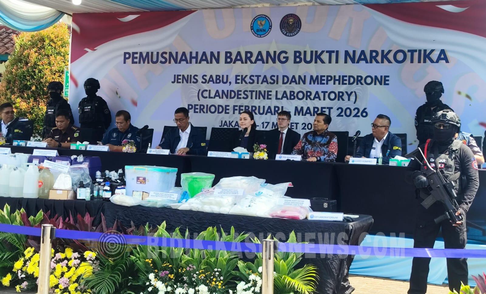 BIDIK-KASUSNEWS.COM Jakarta – Badan Narkotika Nasional (BNN) kembali menunjukkan komitmennya dalam memberantas peredaran narkotika dengan memusnahkan puluhan kilogram barang bukti hasil pengungkapan sejumlah kasus besar, Selasa (17/3/2026). Pemusnahan dilakukan di Lapangan Parkir BNN, Cawang, Jakarta Timur, dengan total barang bukti mencapai 34.211,96 gram. Rinciannya meliputi sabu seberat 27.729,86 gram, ekstasi 1.829 gram atau 3.916 butir, mephedrone padatan 643,6 gram, mephedrone cair 7.247 mililiter, serta berbagai prekursor dan bahan kimia lainnya dalam jumlah signifikan. Sebagian besar barang bukti tersebut merupakan hasil pengungkapan jaringan narkotika melalui jalur udara, khususnya di Bandara Soekarno-Hatta. Dalam operasi gabungan bersama Bea dan Cukai serta petugas bandara, aparat berhasil mengamankan sedikitnya 11 pelaku yang berperan sebagai kurir lintas wilayah, dengan tujuan distribusi ke kawasan Indonesia timur seperti Lombok dan Sulawesi. Tak hanya itu, BNN juga berhasil membongkar praktik clandestine laboratory atau laboratorium ilegal pembuatan narkotika di wilayah Gianyar, Bali. Laboratorium tersebut dikendalikan oleh dua warga negara asing asal Rusia yang diduga memproduksi narkotika sintetis jenis mephedrone. Pengungkapan ini menjadi salah satu operasi besar yang mencerminkan semakin kompleksnya modus operandi jaringan narkotika internasional yang menyasar Indonesia. Mulai dari penyelundupan melalui bandara hingga produksi mandiri di dalam negeri, seluruh pola tersebut terus diantisipasi aparat melalui strategi pencegahan dan penindakan. Dalam rangkaian pengungkapan kasus, BNN mencatat sedikitnya sembilan laporan kasus narkotika dengan total 13 tersangka. Para pelaku menggunakan berbagai modus, mulai dari menyembunyikan sabu dalam koper, pakaian, hingga pengiriman paket dengan identitas palsu. Beberapa di antaranya dikendalikan oleh jaringan internasional dan buronan yang masih dalam pengejaran. BNN menegaskan bahwa langkah tegas ini merupakan bagian dari upaya berkelanjutan pemerintah dalam memerangi narkoba serta melindungi masyarakat dari dampak buruk penyalahgunaan narkotika. Selain penindakan, BNN juga mengajak masyarakat untuk turut berperan aktif dalam pencegahan. Mulai dari menjaga lingkungan keluarga, mendukung edukasi anti-narkoba, hingga melaporkan aktivitas mencurigakan melalui kanal resmi seperti Call Center 184. “Perang melawan narkoba membutuhkan keterlibatan semua pihak. Dengan sinergi yang kuat, cita-cita Indonesia Bersih Narkoba (Bersinar) dapat terwujud,” demikian imbauan BNN. Pemusnahan barang bukti ini sekaligus menjadi pesan tegas bahwa negara tidak akan memberi ruang bagi peredaran narkotika, baik yang masuk melalui jalur internasional maupun yang diproduksi di dalam negeri. (Agus)