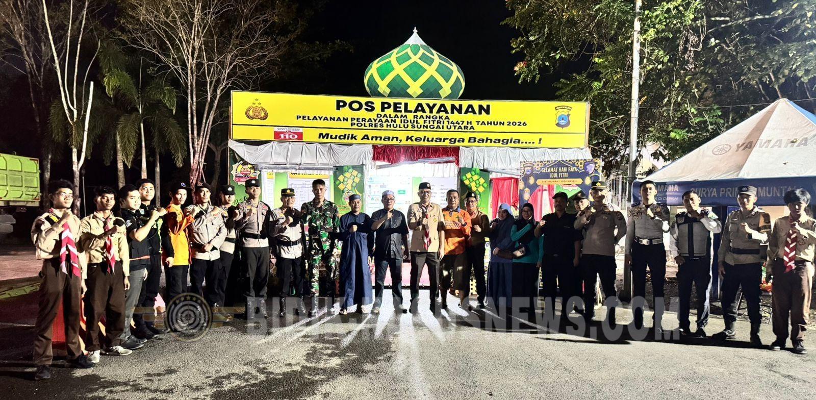 BIDIK-KASUSNEWS.COM Hulu Sungai Utara – Guna memastikan kesiapan pelayanan kepada masyarakat selama arus mudik Lebaran, Kapolres Hulu Sungai Utara AKBP Agus Nuryanto bersama Wakil Bupati HSU melakukan kunjungan ke Pos Pelayanan (Pos Yan) Operasi Ketupat Intan 2026, Rabu malam (18/3/2026). Kunjungan yang berlangsung sekitar pukul 22.00 WITA ini dilakukan sebagai bentuk pengawasan langsung terhadap kesiapan personel serta fasilitas pendukung di lapangan. Dalam kegiatan tersebut, jajaran Polres Hulu Sungai Utara memastikan bahwa seluruh layanan kepada masyarakat berjalan optimal. Pos Pelayanan Ketupat Intan 2026 menjadi salah satu titik strategis dalam memberikan informasi, pengamanan, serta pelayanan bagi para pemudik yang melintas di wilayah Hulu Sungai Utara. Kehadiran pimpinan daerah dan kepolisian di lokasi juga menjadi bentuk dukungan moril bagi personel yang tengah bertugas. Selain melakukan pengecekan, Kapolres dan Wakil Bupati juga memantau kondisi arus lalu lintas di sekitar pos. Berdasarkan hasil pantauan, situasi terpantau lancar tanpa adanya gangguan yang signifikan. Kegiatan ini menjadi bagian dari upaya sinergi antara pemerintah daerah dan aparat kepolisian dalam menciptakan situasi yang aman dan kondusif selama pelaksanaan Operasi Ketupat 2026. Selama kunjungan berlangsung, situasi tetap aman, tertib, dan terkendali. Diharapkan, melalui langkah ini, masyarakat dapat merasakan kehadiran negara dalam memberikan rasa aman dan nyaman selama perjalanan mudik Lebaran. (Agus)