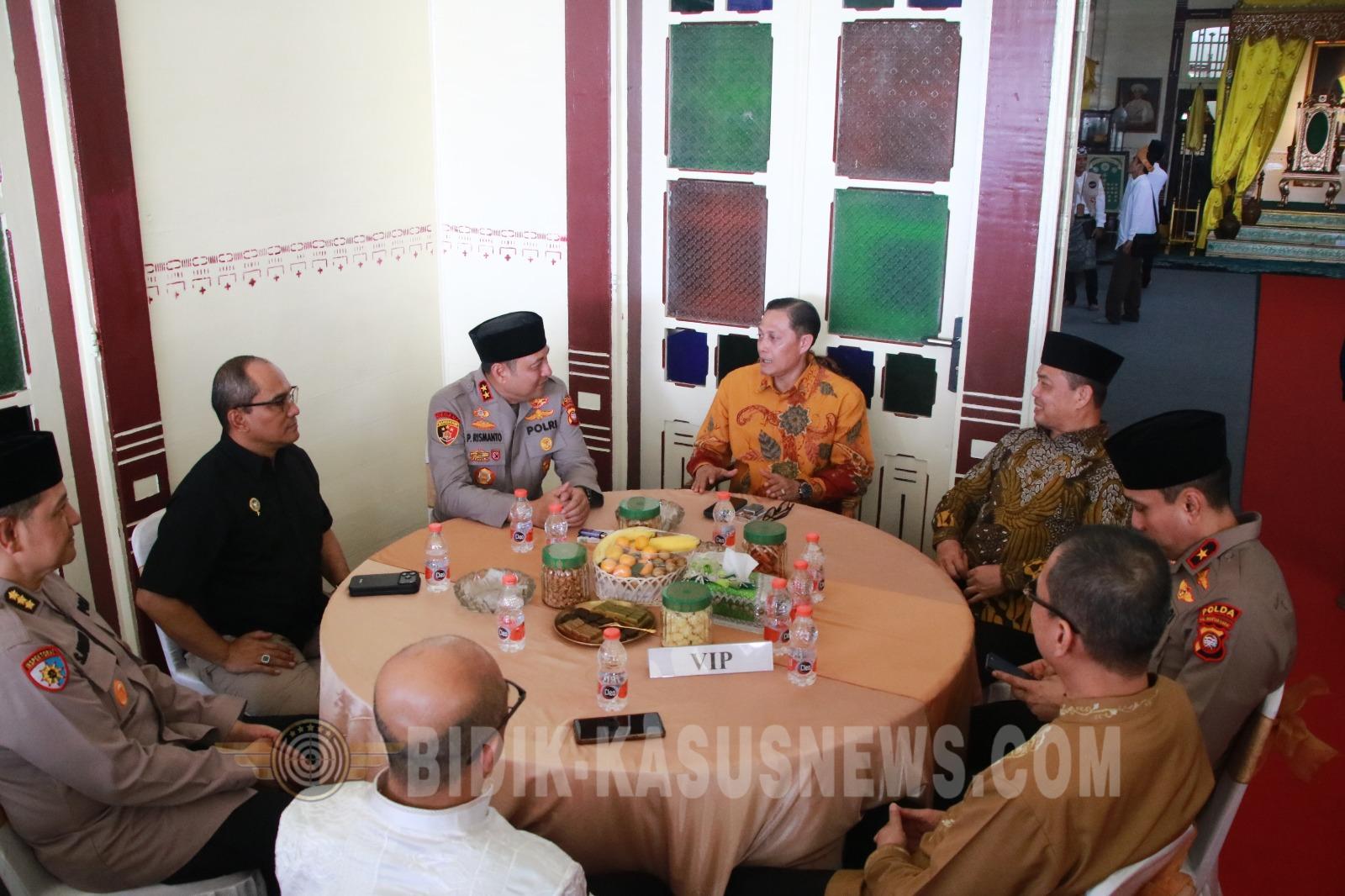 Bidik-kasusnews.com,Pontianak Kalimantan Barat Dalam nuansa khidmat Idul Fitri 1447 H / 2026, Kapolda Kalimantan Barat, Irjen Pol. Dr. Pipit Rismanto, S.I.K., M.H., didampingi Wakapolda Kalbar, Brigjen Pol Hindarsono, S.I.K., S.H., M.Hum, dan Irwasda Polda Kalbar, Kombes Pol Sigit Jatmiko, S.H., S.I.K., melakukan kunjungan silaturahmi kepada Sultan Pontianak IX di Keraton Kadriah, Jalan Tanjung Raya 1, Kelurahan Dalam Bugis, Kecamatan Pontianak Timur. (Selasa, 24/03/26) Kunjungan ini menjadi simbol kuatnya kedekatan antara Kepolisian Daerah Kalimantan Barat dengan Tokoh Masyarakat di Kota Pontianak. Suasana semakin istimewa dengan hadirnya elemen Forkopimda lainnya, yakni Gubernur Kalbar, Drs. H. Ria Norsan, M.M., M.H., dan Pangdam XII/Tanjungpura, Mayjen TNI Novi Rubadi Sugito, S.I.P., M.Si., yang menunjukkan soliditas kepemimpinan di Kalimantan Barat. Melalui kunjungan ini, Kapolda Kalbar berharap semangat kekeluargaan dan sinergitas lintas sektoral terus terjaga demi mewujudkan wilayah yang aman, damai, dan kondusif. “Tradisi silaturahmi di Keraton Kadariah ini bukan sekadar seremonial, melainkan jembatan untuk mempererat persatuan antara pemerintah, aparat keamanan, dan seluruh lapisan masyarakat Kalbar dalam merayakan hari kemenangan.” “Kebersamaan ini menegaskan bahwa stabilitas keamanan di Kalimantan Barat dibangun di atas fondasi komunikasi yang harmonis antara pemimpin dan tokoh Masyarakat.” Ungkap Pipit. Senada dengan hal tersebut, Kabid Humas Polda Kalbar selaku Kasatgas Humas Ops Ketupat Kapuas 2026, Kombes Pol. Bambang Suharyono, S.I.K., M.H., menegaskan bahwa kegiatan silaturahmi ini merupakan bagian dari upaya Cooling System untuk menjaga kesejukan situasi kamtibmas pasca-Lebaran. ”Kegiatan silaturahmi ini menjadi simbol bahwa Polri selalu hadir di tengah Masyarakat dan merangkul seluruh elemen Masyarakat. Kondusivitas Kalbar adalah prioritas utama kami, dan sinergi lintas sektoral ini adalah kuncinya,” Jelas Bambang. Kunjungan tersebut ditutup dengan doa bersama untuk kesejahteraan Masyarakat Kalimantan Barat, mempertegas pesan bahwa hari kemenangan adalah momentum untuk memperkuat persaudaraan lintas sektoral di Bumi Khatulistiwa. Wartawan Mulyawan