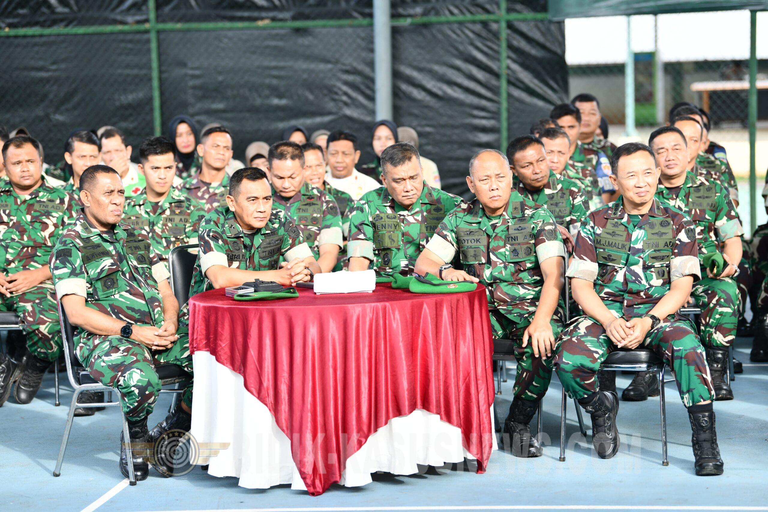 BIDIK-KASUSNEWS.COM JAKARTA – Komandan Pusat Teritorial Angkatan Darat Letjen TNI Mochamad Syafei Kasno bersama para Pejabat Utama Pusterad, dan segenap prajurit serta Pegawai Negeri Sipil (PNS) Pusterad, melaksanakan Apel Khusus dan Halal Bihalal 1447 Hijriah/2026 Masehi, bertepat di Lapangan Tenis Mapusterad, Jl. Setu Cipayung, Jakarta Timur, Rabu (25/3/2026). Dalam kesempatan tersebut, Danpusterad menyampaikan ucapan Selamat Hari Raya Idul Fitri 1447 H/2026 M kepada seluruh keluarga besar Pusterad, “Saya atas nama pribadi, keluarga dan dinas mengucapkan Selamat Hari Raya Idul Fitri 1447 Hijriah. Mohon Maaf Lahir dan Batin. Semoga ibadah yang telah dilaksanakan selama bulan Ramadan diterima oleh Allah SWT, diampuni segala dosa, serta kita kebali dalam keadaan suci,”ungkapnya. Lebih lanjut, Danpusterad menyampaikan bahwa kegiatan ini juga dirangkaikan dengan apel pengecekan personel usai pelaksanaan cuti bersama Hari Raya Idul Fitri. Dari hasil pengecekan, seluruh personel dapat kembali dan hadir dalam keadaan aman,“Saya sempat mengkhawatirkan adanya kendala di perjalanaan, namun bersyukur seluruh personel dapat kembali dengan selamat,”tambahnya. Selain itu, Dapusterad juga mengingatkan pentingnya menyimak khutbah setelah pelaksanaan Sholat Idu Fitri. Ia menegaskan bahwa mendengarkan khutbah merupakan sunnah muakkad (sangat dianjurkan), “Dengan menyimak khutbah, kita tidak hanya memperoleh pahala, tetapi juga mendapatkan nasihat dan hikmah yang bermanfaat dalam kehidupan sehari-hari,”tutupnya. (Agus)