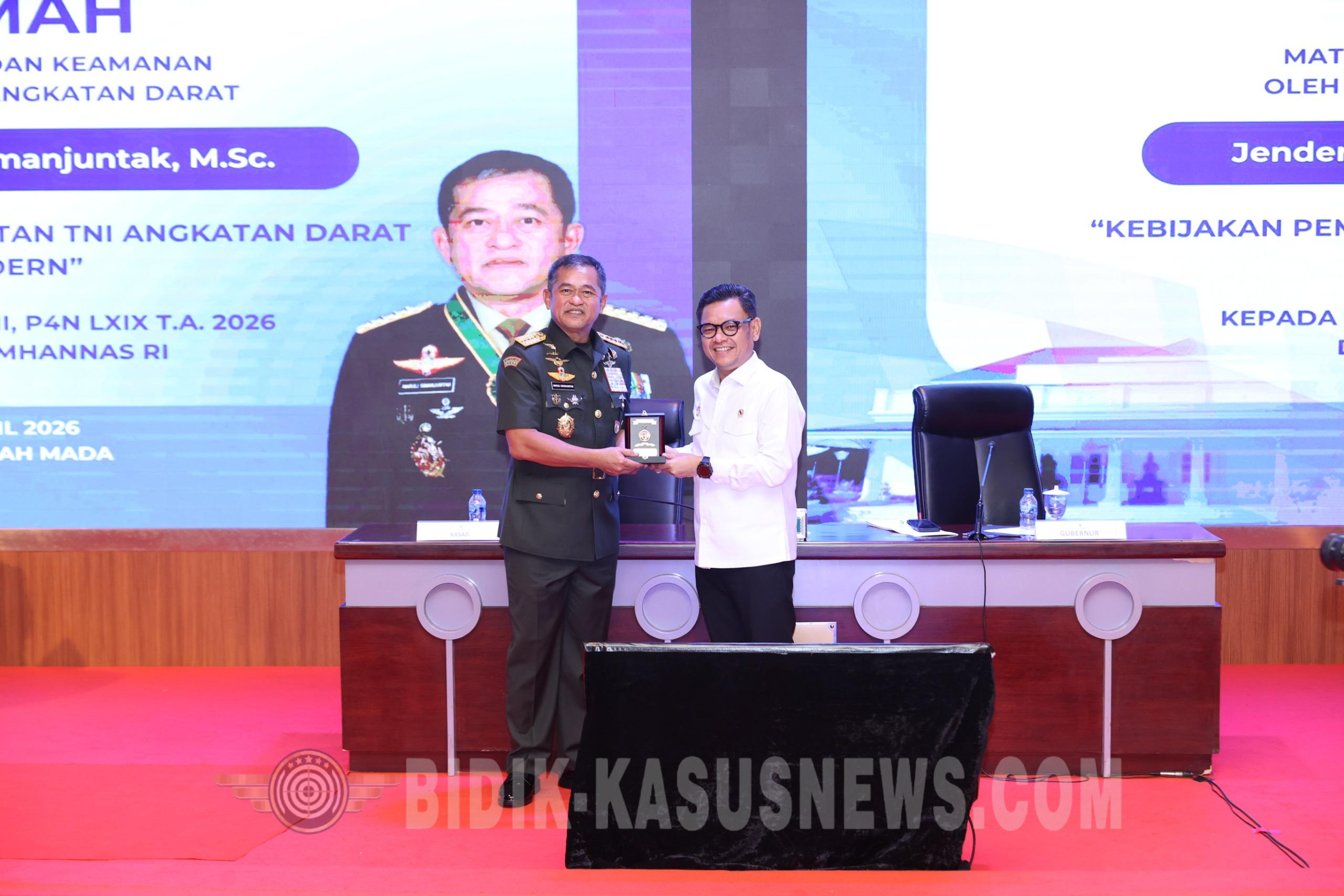 JAKARTA, Bidik-kasusnews.com – Kepala Staf Angkatan Darat (Kasad) Jenderal TNI Maruli Simanjuntak, M.Sc., menegaskan bahwa dukungan terhadap program pemerintah harus menjadi prioritas seluruh unsur bangsa sesuai bidang tugas masing-masing. Penegasan tersebut disampaikannya saat memberikan pembekalan kepada peserta Pendidikan Pemantapan Pimpinan Nasional (P3N) Angkatan XXVII dan Program Pendidikan Penyiapan dan Pemantapan Pimpinan Nasional (P4N) Angkatan LXIX di Lembaga Ketahanan Nasional Republik Indonesia, Selasa (8/4/2026). Kegiatan itu diikuti 85 peserta P3N dan 104 peserta P4N yang berasal dari unsur TNI, Polri, kementerian, lembaga pemerintah nonkementerian, badan usaha, dan organisasi masyarakat. Di hadapan para peserta, Kasad menekankan bahwa setiap unsur pemerintahan harus memahami prioritas yang dapat dilakukan dalam mendukung berbagai program pemerintah. Kasad menjelaskan bahwa Indonesia memiliki potensi dan sumber daya yang sangat besar. Namun, potensi tersebut harus diimbangi dengan inovasi di berbagai bidang agar mampu memperkuat pertahanan negara sekaligus meningkatkan kesejahteraan masyarakat. Menurut Kasad, pembinaan kekuatan TNI AD harus dilaksanakan secara terencana, terpadu, dan berkelanjutan guna mewujudkan postur pertahanan negara yang modern, profesional, dan adaptif terhadap perkembangan lingkungan strategis. Kemudian seluruh kebijakan Presiden untuk meningkatkan pendapatan negara dan kesejahteraan masyarakat, lanjutnya, juga harus didukung penuh. Selain membangun kekuatan pertahanan dan meningkatkan kesejahteraan prajurit, Kasad mengatakan TNI AD terus berupaya membantu masyarakat melalui program ketahanan pangan, penyediaan air bersih, serta pengairan pertanian dan perkebunan. “Kita sudah buat sekitar 6.000 sumber air di seluruh Indonesia dan akan terus kita jalankan. Data kita, sekitar 27 juta masyarakat belum menikmati air bersih,” ujar Kasad. Kasad juga menegaskan TNI AD bergerak cepat dalam penanganan bencana agar masyarakat terdampak tidak terlalu lama berada dalam kesulitan. Sementara di bidang alutsista, TNI AD terus mengembangkan sistem pertahanan dan inovasi teknologi. “Kita sudah harus siapkan, anak-anak kita sudah mampu membuat peralatan tempur yang juga dimiliki negara lain,” imbuhnya. (Agus)