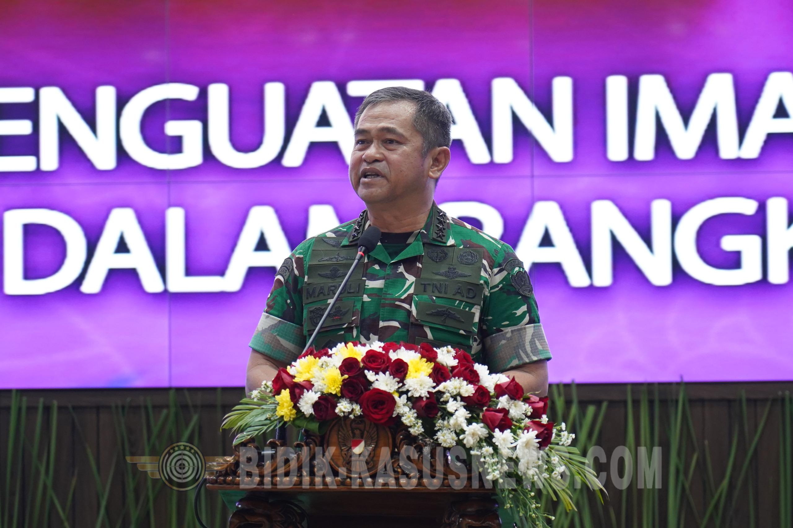JAKARTA, Bidik-kasusnews.com – Kepala Staf Angkatan Darat (Kasad) Jenderal TNI Maruli Simanjuntak, M.Sc., menegaskan bahwa Indonesia yang maju hanya dapat diwujudkan apabila seluruh elemen bangsa bersatu dan mengesampingkan perbedaan. Hal tersebut disampaikan Kasad saat menghadiri peringatan Paskah bersama prajurit, PNS, dan anggota Persit Kartika Chandra Kirana wilayah Jakarta dan sekitarnya di Aula Jenderal Besar A.H. Nasution, Markas Besar Angkatan Darat, Kamis (9/4/2026). Menurut Kasad, peringatan hari besar keagamaan harus menjadi momentum untuk saling menghormati, memperkuat persaudaraan, dan membangun kebersamaan. Karena itu, ia mengajak seluruh prajurit dan ASN TNI AD untuk terus menjaga solidaritas dalam pelaksanaan tugas maupun kehidupan bermasyarakat. Peringatan Paskah yang turut dihadiri Ketua Umum Persit Kartika Chandra Kirana (KCK) Ny. Uli Simanjuntak tersebut berlangsung khidmat dan penuh kebersamaan. Kegiatan yang mengusung tema “Paskah Mewujudkan Penguatan Iman serta Solidaritas Prajurit dan ASN TNI AD yang Prima dalam Rangka Mendukung Indonesia Maju” itu menjadi sarana memperkuat keimanan sekaligus soliditas di lingkungan TNI AD. Dalam sambutannya, Kasad menegaskan bahwa perayaan Paskah tidak sekadar menjadi kegiatan seremonial keagamaan, tetapi juga momentum untuk memperkokoh kebersamaan dalam mendukung tugas pengabdian kepada bangsa dan negara. “Momen-momen seperti ini untuk kita saling mengingatkan. Perayaan Paskah ini kita harapkan mampu menumbuhkan nilai-nilai keimanan yang kuat, serta membangun solidaritas yang kokoh dalam mendukung pelaksanaan tugas pokok TNI AD secara optimal. Kalau kita mau maju berarti harus sama-sama menghilangkan (mengesampingkan) perbedaan untuk Indonesia maju,” ujar Kasad. Ibadah Paskah dipimpin Pendeta Godlif Yohanes dan turut dihadiri Wakil Uskup TNI-Polri Romo Kolonel (Sus) Yos Bintoro, Pr., serta Sekretaris Komisi Hubungan Antaragama dan Kepercayaan Konferensi Waligereja Indonesia (KWI) Romo Aloysius Budi Purnomo. Rangkaian kegiatan juga diisi renungan, penyalaan lilin Paskah oleh Kasad dan Ketua Umum Persit KCK, serta doa bersama yang dipimpin Pendeta Etika Saragih. (Agus)