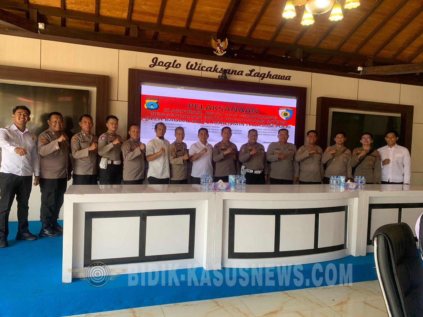 BIDIK-KASUSNEWS.COM Hulu Sungai Utara – Dalam upaya meningkatkan kualitas pengawasan internal dan akuntabilitas kinerja, Tim Bag Dalmutu Rorenmin Itwasum Polri melaksanakan kegiatan klarifikasi, reviu, serta monitoring pengendalian mutu pengawasan intern di jajaran Polda Kalimantan Selatan, termasuk Polres Hulu Sungai Utara (HSU), Kamis (9/4/2026). Kegiatan yang dimulai pukul 09.00 WITA tersebut berlangsung di Aula Polres Tanah Laut dan diikuti oleh para pejabat utama (PJU) Polres HSU, mulai dari Kabag SDM, Kabag Ops, Kabag Logistik, hingga para kasat fungsi serta operator terkait. Tim Itwasum Polri yang dipimpin oleh Kombes Pol M. Setyobudi Dwiputro, S.I.K., M.Si., bersama Kombes Pol Achmad Fauzy, S.H., S.I.K., M.I.K., AKP Syarifah Umi Khabibah, dan Bripda Sulistia Marwah, melakukan evaluasi menyeluruh terhadap pelaksanaan pengawasan internal di lingkungan Polres HSU. Kegiatan ini juga didampingi oleh Tim Itwasda Polda Kalsel yang dipimpin Kombes Pol Tri Hambodo, S.I.K., M.H., bersama sejumlah personel lainnya. Dalam pelaksanaannya, tim melakukan klarifikasi data, reviu terhadap sistem pengawasan, serta monitoring pengendalian mutu guna memastikan seluruh proses berjalan sesuai dengan standar operasional dan prinsip akuntabilitas. Langkah ini menjadi bagian dari strategi Polri dalam memperkuat fungsi pengawasan internal, sekaligus mendorong peningkatan kinerja organisasi yang transparan, profesional, dan berintegritas. Kapolres HSU melalui kegiatan tersebut menegaskan komitmen jajarannya dalam mendukung penuh pelaksanaan pengawasan internal sebagai bagian dari reformasi birokrasi Polri. Evaluasi ini diharapkan mampu mengidentifikasi potensi perbaikan sekaligus meningkatkan kualitas pelayanan kepada masyarakat. Selama kegiatan berlangsung, situasi terpantau aman, tertib, dan lancar. Kegiatan ini menjadi wujud nyata sinergi antara Itwasum Polri dan jajaran kewilayahan dalam mewujudkan tata kelola organisasi yang lebih baik dan berkelanjutan. Dengan adanya monitoring dan reviu ini, diharapkan Polres HSU semakin optimal dalam menjalankan fungsi pengawasan internal demi mendukung Polri yang Presisi—prediktif, responsibilitas, dan transparansi berkeadilan. (Agus)