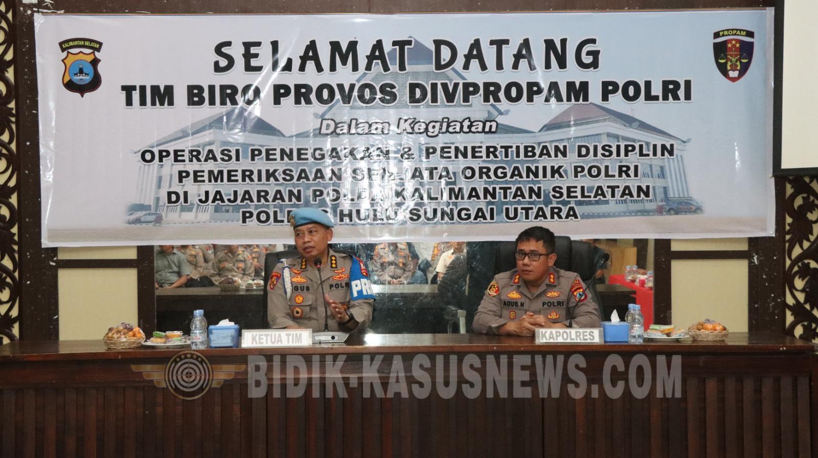 HSU, BIDIK-KASUSNEWS.COM – Divisi Profesi dan Pengamanan (DivPropam) Mabes Polri menggelar Penegakan dan Penertipan Disiplin (Gaktiplin) dengan sasaran Senjata Api (Senpi) dan amunisi di Polres HSU, Selasa (14/4/2026). Kapolres Hulu Sungai Utara AKBP Agus Nuryanto, S.I.K, M.Si mengatakan ini bagian dari pengawasan internal untuk mencegah penyalahgunaan Senpi dan amunisi. Lanjut, ia menjelaskan pemeriksaan ini tak hanya menyasar ke senpi dan amunisi yang dipegang oleh personel. Namun senpi dan amunisi yang tersimpan di gudang logistik juga diperiksa. “Secara keseluruhan dicek tim Divpropam Mabes Polri dan Seslog Polri mulai dari kondisi fisik hingga pencocokan nomor senjata yang disesuaikan dengan data administrasi logistik,” jelas Kapolres HSU. Ia juga menyebut dari hasil pemeriksaan di Polres HSU tidak ditemukan adanya pelanggaran ataupun penyalahgunaan senpi dan amunisi. “Tidak ada pelanggaran ataupun penyalahgunaan. Semua sesuai dengan data administrasi logistik dan fisik senjata api. Baik itu yang dipegang personel maupun yang tersimpan di gudang logistik,” terang Kapolres HSU. Kemudian ia juga menuturkan sangat menyambut baik kegiatan yang digelar Divpropam Mabes Polri di Polres HSU ini. “Kami sangat berterima kasih atas periksaan ini. Tentunya hal ini membuat kami semua selalu disiplin. Baik itu soal penggunaan senjata api maupun hal lainnya,” tutur Kapolres HSU. Dikesempatan itu tim Divpropam Mabes Polri yang dipimpin Kombes Pol Agus Halimudin, S.H., S.I.K., M.H. memberikan penekanan terkait pentingnya penggunaan senjata api secara profesional, proporsional, dan sesuai prosedur. Menurutnya senjata api merupakan alat yang harus dijaga dengan penuh tanggung jawab, sehingga setiap anggota wajib mematuhi aturan yang berlaku. Selain tim Divpropam Mabes Polri. Kegiatan tersebut juga diikuti Slog Mabes Polri. Kemudian juga ada tim Bid Propam Polda Kalsel yang dipimpin Kasubbid Provos Bid Propam Polda Kalsel AKBP Zaenal Arifien S.H., M.Ag dan personel jajaran Bid Propam Polda Kalsel. Kemudian juga tampak diikuti Wakapolres HSU beserta pejabat utama, Kapolsek jajaran hingga seluruh personel Polres HSU yang memegang senjata api dinas. (Agus)