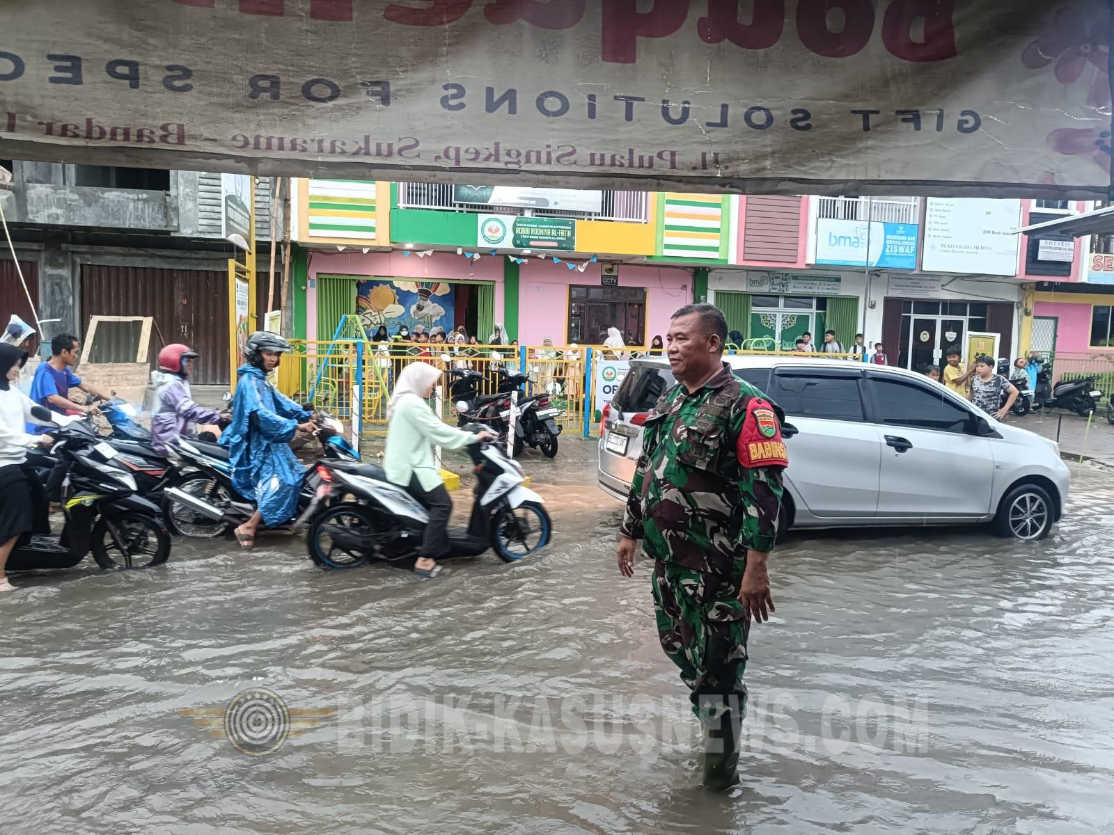 Bandar Lampung, Bidik-kasusnews.com, Hujan deras yang mengguyur wilayah Bandar Lampung pada Senin sore mengakibatkan genangan air setinggi 10 centimeter di Jalan Pulau Singkep, tepatnya di perbatasan Kelurahan Sukarame dan Kelurahan Sukabumi. Namun, kehadiran Babinsa Kelurahan Sukabumi, Sertu Subianto, dari Koramil 410-01/PJG, memberikan ketenangan bagi warga setempat. Dengan sigap, Sertu Subianto memonitor langsung kondisi genangan air yang berpotensi mengganggu aktivitas warga dan arus lalu lintas. Tidak hanya memantau, ia juga bergerak aktif membantu memperlancar aliran air agar genangan segera surut. Tindakan cepat ini merupakan wujud nyata kepedulian TNI dalam mengatasi kesulitan rakyat di lapangan. “Ketika hujan mulai reda, genangan berangsur surut kembali. Namun selama hujan masih turun, kami terus memastikan aliran air tidak tersumbat dan warga tetap aman,” ujar Sertu Subianto saat ditemui di lokasi. Kegiatan yang dimulai pukul 17.00 WIB hingga selesai ini dilakukan dengan penuh semangat. Sertu Subianto bahkan tak segan menyusuri saluran air dan membersihkan sampah-sampah ringan yang menghambat aliran. Warga sekitar yang melihat aksi Babinsa tersebut mengaku terbantu dan merasa lebih aman. “Sangat bersyukur ada Pak Babinsa yang langsung terjun. Kami jadi tidak khawatir meskipun hujan deras,” ujar salah seorang warga Jalan Pulau Singkep. Kehadiran Babinsa di tengah-tengah warga, terutama saat kondisi darurat seperti genangan air, membuktikan bahwa TNI selalu hadir sebagai pelindung dan pengayom masyarakat. Sertu Subianto juga mengimbau warga untuk tetap waspada terhadap potensi genangan di musim hujan serta menjaga kebersihan saluran air di lingkungan masing-masing. Laporan kegiatan ini disampaikan melalui rantai komando Koramil 410-01/PJG kepada Kodim 0410/KBL, sebagai bentuk transparansi dan sinergi TNI dalam pelayanan publik. Dengan semangat “Tetap Semangat, Pantang Menyerah, Selalu Gembira dalam Tugas”, Sertu Subianto dan seluruh jajaran Babinsa terus berkomitmen untuk selalu siaga membantu rakyat kapan pun dan di mana pun. (Agus)