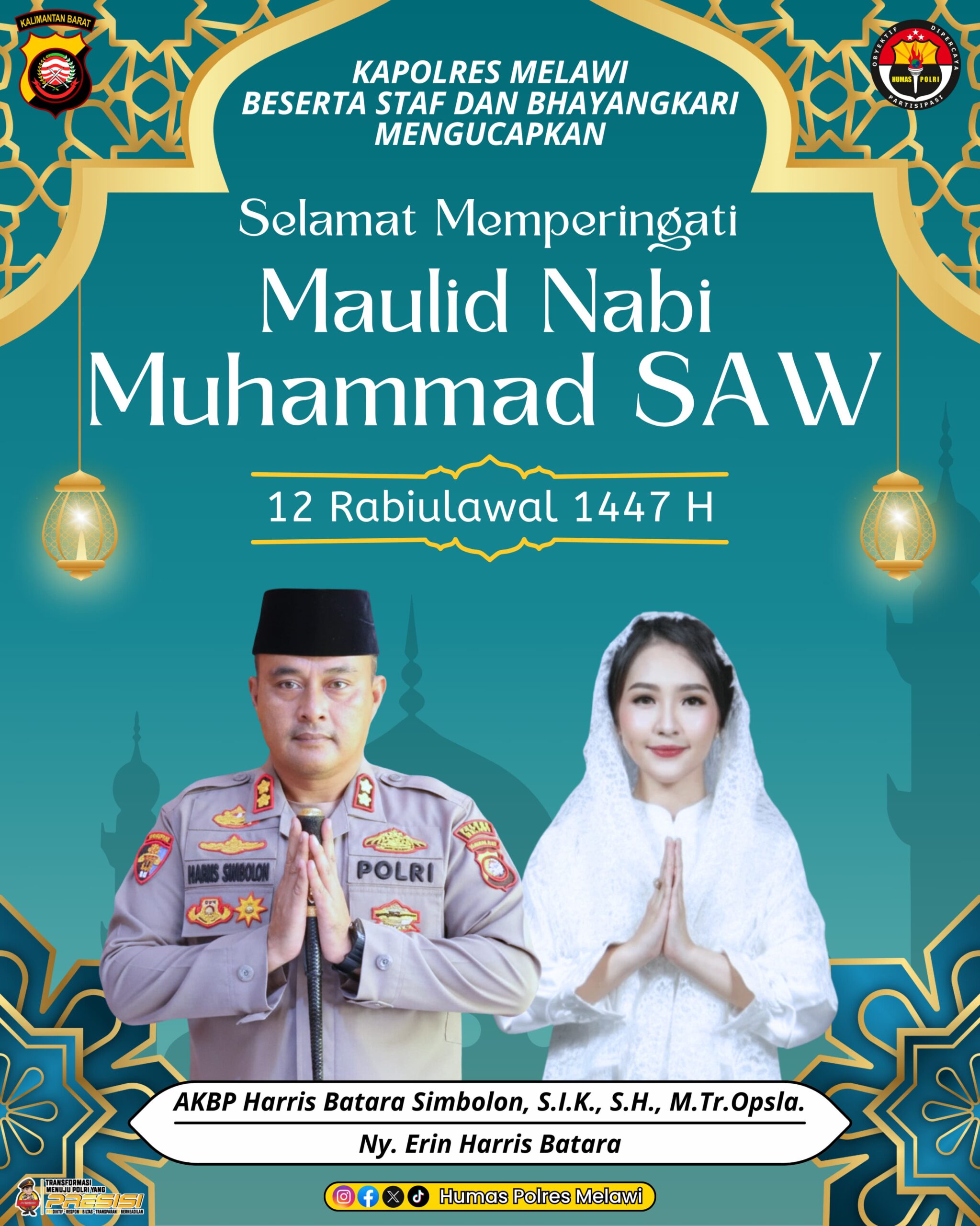 Bidik-kasusnews.com,Nanga Pinoh Kalimantan Barat Jumat-05-September-2025 Kapolres Melawi,AKBP Harris Batara Simbolon,S.I.K.,S.H.,M.Tr.Opsla,beserta staf dan Bhayangkari mengucapkan Selamat Memperingati Maulid Nabi Muhammad SAW, 12 Rabiulawal 1447 H/2025. Semoga peringatan ini dapat meningkatkan kecintaan dan pengamalan ajaran Nabi Muhammad SAW dalam kehidupan sehari-hari. Kapolres Melawi berharap peringatan Maulid Nabi Muhammad SAW dapat menjadi momentum untuk mempererat silaturahmi dan meningkatkan kesadaran dalam menjalankan tugas dengan penuh integritas dan profesionalisme. Wartawan Basori