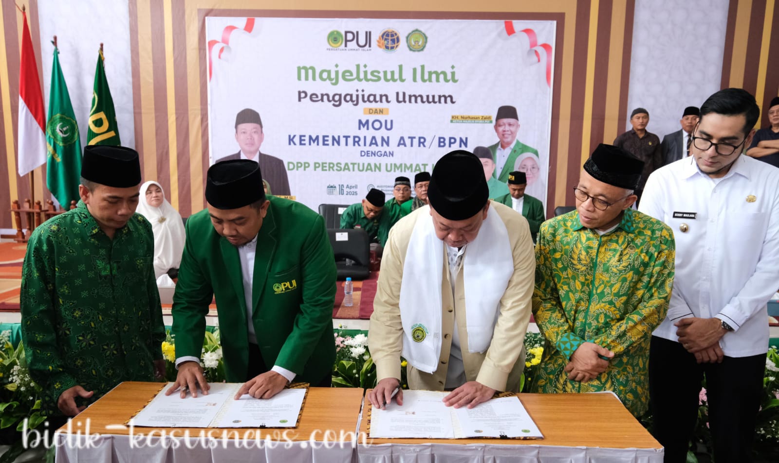 SUKABUMI, Bidik-Kasusnews.com – Kementerian Agraria dan Tata Ruang/Badan Pertanahan Nasional (ATR/BPN) menjalin kerja sama strategis dengan Dewan Pimpinan Pusat Persatuan Ummat Islam (DPP PUI) dalam rangka mengoptimalkan pemanfaatan tanah wakaf. Penandatanganan Nota Kesepahaman dilakukan langsung oleh Menteri ATR/BPN, Nusron Wahid, di Pondok Pesantren Syamsul ‘Ulum, Kota Sukabumi pada Rabu (16/4/2025). Kerja sama ini menandai langkah konkret dalam memperkuat tata kelola aset wakaf agar lebih produktif dan bermanfaat bagi masyarakat luas, khususnya dalam bidang sosial, pendidikan, dan ekonomi keumatan. Menteri Nusron menyampaikan pentingnya melibatkan berbagai elemen masyarakat dalam mengelola lahan yang belum termanfaatkan secara maksimal. “Pemanfaatan tanah tidak bisa eksklusif, harus adil dan merata. Umat harus diberi ruang untuk ikut mendorong kemajuan melalui lahan-lahan wakaf yang dikelola dengan baik,” ungkapnya. Dukungan juga datang dari Ketua Umum DPP PUI, Raizal Arifin, yang menilai bahwa MoU ini menjadi momentum penting untuk meningkatkan kapasitas organisasi keagamaan dalam mengelola aset tanah secara profesional. Sebagai tindak lanjut dari MoU tersebut, ATR/BPN menyerahkan delapan sertipikat tanah wakaf kepada berbagai lembaga keagamaan di Sukabumi. Sertipikat ini mencakup lahan milik pondok pesantren, yayasan, serta musala yang selama ini belum memiliki legalitas yang kuat. Momen tersebut juga diisi dengan ziarah ke makam KH. Ahmad Sanusi, ulama karismatik pendiri Pesantren Syamsul ‘Ulum, sebagai bentuk penghormatan atas warisan perjuangan beliau di bidang keagamaan dan pendidikan. Acara turut dihadiri oleh sejumlah pejabat, termasuk Wakil Wali Kota Sukabumi Bobby Maulana, Ketua Majelis Syura PUI Nurhasan Zaldi, serta jajaran Kementerian ATR/BPN. Selain itu hadir mendampingi menteri Dirjen Penetapan Hak dan Pendaftaran Tanah Asnaedi, Kepala Biro Humas Harison Mocodompis, dan Kakanwil BPN Jawa Barat Yanuar Hikmat Ginanjar. Sinergi ini diharapkan mempercepat langkah menuju pengelolaan tanah wakaf yang modern, berkelanjutan, dan berdampak langsung bagi kesejahteraan umat. (UM)