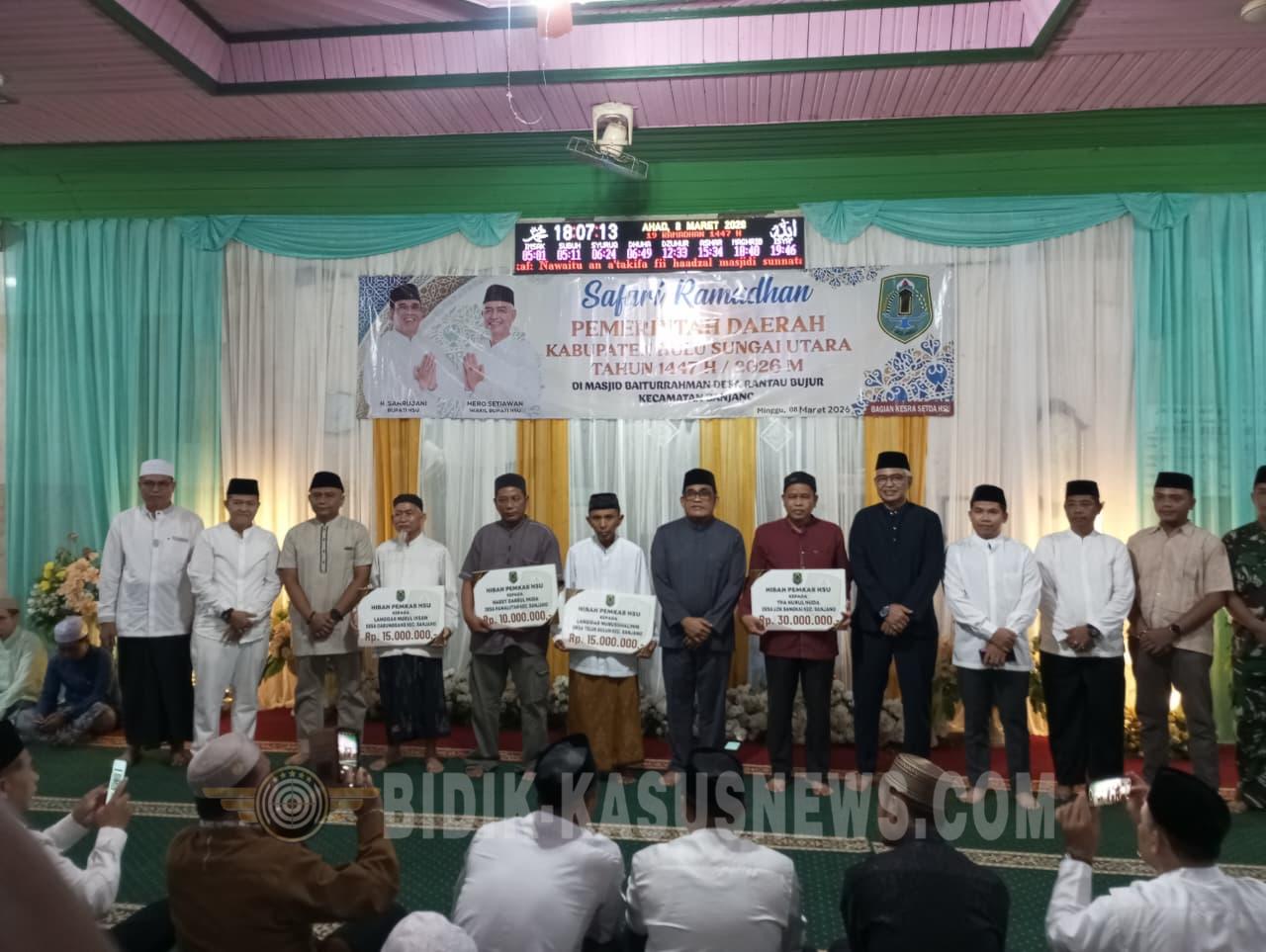 BIDIK-KASUSNEWS.COM Hulu Sungai Utara – Pemerintah Kabupaten Hulu Sungai Utara menggelar kegiatan Safari Ramadan 1447 Hijriah bersama Forum Koordinasi Pimpinan Daerah (Forkopimda) di Masjid Baiturrahman, Minggu (8/3/2026) sore. Kegiatan tersebut diisi dengan silaturahmi, penyerahan bantuan keagamaan, serta buka puasa bersama masyarakat. Acara yang dimulai sekitar pukul 17.30 WITA itu dihadiri oleh Bupati Kabupaten Hulu Sungai Utara, Syahrunjani, bersama Wakil Bupati Hero Setiawan, Sekretaris Daerah Adi Lesmana, serta sejumlah pejabat daerah dan unsur Forkopimda. Turut hadir perwakilan dari Polres Hulu Sungai Utara yang diwakili Kapolsek Banjang Robby Ansharie Bahasuan, perwakilan Kodim 1001/HSU-BLG, Kepala Kejaksaan Negeri Amuntai Budi Triono, perwakilan Kementerian Agama, para kepala desa se-Kecamatan Banjang, tokoh agama, serta sekitar 350 warga yang hadir memadati masjid. Rangkaian acara diawali dengan pembukaan dan pembacaan ayat suci Al-Qur’an, dilanjutkan sambutan panitia pelaksana serta penyerahan bantuan hibah keagamaan secara simbolis oleh Bupati dan Wakil Bupati bersama unsur Forkopimda. Dalam kesempatan tersebut, pemerintah daerah menyerahkan bantuan kepada sejumlah lembaga keagamaan di wilayah Kecamatan Banjang, antara lain untuk Langgar Nurul Ihsan Desa Garunggang, Langgar Nurulsalihin Desa Teluk Buluh, Kelompok Habsyi Darbul Huda Desa Pawalutan, serta TPA Nurul Huda Desa Lok Bangkai. Bupati Syahrunjani dalam sambutannya menyampaikan bahwa Safari Ramadan merupakan agenda tahunan pemerintah daerah yang bertujuan mempererat silaturahmi antara pemerintah dan masyarakat, khususnya di bulan suci Ramadan. “Melalui kegiatan ini, kami ingin lebih dekat dengan masyarakat sekaligus memperkuat ukhuwah serta mendukung kegiatan keagamaan di daerah,” ujarnya. Acara kemudian dilanjutkan dengan tausiyah yang disampaikan oleh Ustaz Rahmatullah yang mengajak masyarakat memanfaatkan bulan Ramadan untuk meningkatkan keimanan dan ketakwaan kepada Allah SWT. Kegiatan ditutup dengan doa bersama, buka puasa bersama, serta pelaksanaan salat Magrib berjamaah di Masjid Baiturrahman. Seluruh rangkaian acara berlangsung hingga sekitar pukul 19.00 WITA dalam suasana aman, tertib, dan penuh kebersamaan. Safari Ramadan ini diharapkan dapat mempererat hubungan antara pemerintah daerah, aparat, dan masyarakat sekaligus menjadi momentum untuk memperkuat nilai-nilai kebersamaan di tengah kehidupan sosial masyarakat. (Agus)