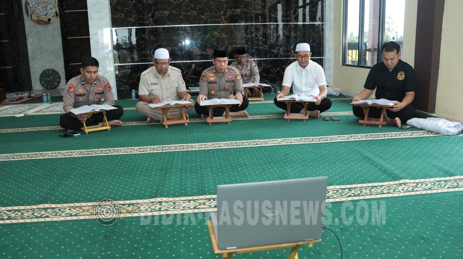HSU | BIDIK-KASUSNEWS.COM – Dalam rangka meningkatkan keimanan dan ketakwaan di bulan suci Ramadan 1447 Hijriah, jajaran Polres Hulu Sungai Utara mengikuti kegiatan tadarus Al-Qur’an secara virtual yang terhubung langsung dengan Kepolisian Negara Republik Indonesia (Mabes Polri). Kegiatan tersebut merupakan bagian dari program Pembinaan Rohani dan Mental (Binrohtal) yang dilaksanakan serentak oleh jajaran Polri di seluruh Indonesia. Pelaksanaan tadarus di Mapolres Hulu Sungai Utara dipimpin oleh Kabag SDM AKP Misransyah, S.H., dan diikuti oleh personel di lingkungan Mapolres. Program ini digelar setiap hari selama Ramadan melalui Zoom Meeting yang dipusatkan dari Bagbinreligi Rowatpers SSDM Polri. Mewakili Kapolres Hulu Sungai Utara AKBP Agus Nuryanto, AKP Misransyah menyampaikan bahwa kegiatan tadarus menjadi sarana penting dalam pembinaan spiritual anggota, terutama di tengah padatnya tugas pelayanan dan pengamanan selama Ramadan. “Melalui tadarus rutin ini, kami berharap personel mampu menjaga keseimbangan antara tanggung jawab kedinasan dan peningkatan keimanan. Spiritualitas yang kuat akan berdampak pada kualitas pelayanan kepada masyarakat,” ujarnya. Dalam pelaksanaannya, personel mengikuti pembacaan Al-Qur’an secara bergiliran per juz yang dipandu langsung oleh tim dari Mabes Polri. Kegiatan tersebut diikuti secara serentak oleh jajaran Polda hingga Polres di seluruh Indonesia. Di Mapolres Hulu Sungai Utara, suasana tadarus berlangsung khidmat di masjid setempat. Lantunan ayat suci Al-Qur’an yang disimak bersama menciptakan nuansa religius sekaligus mempererat kebersamaan antaranggota selama bulan Ramadan. Melalui program Binrohtal ini, diharapkan seluruh personel Polri tidak hanya profesional dalam menjalankan tugas, tetapi juga memiliki landasan moral dan spiritual yang kokoh, sehingga mampu menghadirkan pelayanan yang humanis, berintegritas, dan terpercaya bagi masyarakat. (Agus)