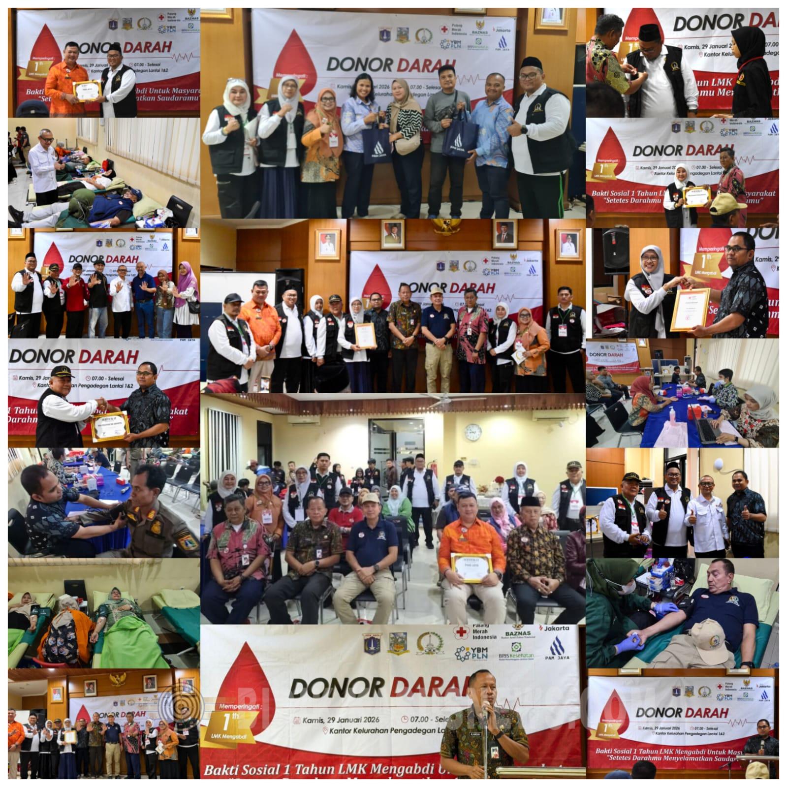 Jakarta Selatan, Bidik-kasusnews.com Memperingati satu tahun masa pengabdian periode 2024–2029, Lembaga Musyawarah Kelurahan (LMK) Pengadegan menggelar kegiatan bakti sosial donor darah yang melibatkan berbagai unsur masyarakat dan pemerintah, Rabu (29/1/2026). Kegiatan berlangsung di Aula Lantai 2 Kantor Kelurahan Pengadegan, Kecamatan Pancoran, Jakarta Selatan. Aksi kemanusiaan bertajuk “Donor Darah untuk Negeri” ini menjadi wujud nyata kepedulian LMK terhadap masyarakat sekaligus memperkuat semangat gotong royong di wilayah Pengadegan. Kegiatan dihadiri Camat Pancoran Alamsyah, Dewan Kota Jakarta Selatan Fathur Rahman, jajaran kelurahan, tenaga kesehatan, organisasi masyarakat, hingga relawan donor darah. Pelaksanaan donor darah didukung tenaga medis dari puskesmas setempat serta tim dari Palang Merah Indonesia wilayah Jakarta Selatan. Perwakilan PMI, dr. Yayat Ruhiyat, menyampaikan apresiasi atas konsistensi LMK Pengadegan dalam mendorong kegiatan sosial yang berdampak langsung bagi masyarakat. Menurut Ketua Panitia, Hartijo, kegiatan ini terselenggara berkat dukungan berbagai pihak, termasuk sponsor dan unsur pemerintah daerah. Ia mengucapkan terima kasih kepada seluruh mitra yang telah membantu terselenggaranya kegiatan, mulai dari instansi pemerintah, dunia usaha, hingga relawan masyarakat. Camat Pancoran Alamsyah dalam sambutannya menilai kegiatan donor darah tersebut sebagai contoh nyata sinergi antara lembaga masyarakat dan pemerintah. Ia berharap LMK Pengadegan terus aktif menjaring aspirasi warga serta berperan dalam pembangunan wilayah melalui forum musyawarah dan kegiatan sosial. Dalam kesempatan itu, PMI juga memberikan apresiasi kepada para pegiat donor darah, termasuk Muhammad Hamim yang dikenal aktif mengikuti kegiatan donor darah rutin bersama anggota Fahira Idris. Selain itu, dilakukan pula penyerahan PIN donor darah, penghargaan dari PMI kepada Ketua LMK Pengadegan Nurlaila, serta pemberian piagam apresiasi kepada para sponsor pendukung kegiatan. Antusiasme masyarakat terlihat tinggi. Dari total 125 pendaftar, sebanyak 80 peserta berhasil mendonorkan darahnya dari 100 kantong darah yang disiapkan PMI. Sementara peserta lainnya belum dapat mendonor karena faktor kesehatan dan persyaratan medis. Melalui kegiatan ini, LMK Pengadegan berharap gerakan donor darah dapat terus menjadi budaya sosial di tengah masyarakat, sekaligus memperkuat nilai kemanusiaan dan solidaritas warga Jakarta Selatan. (Agus)
