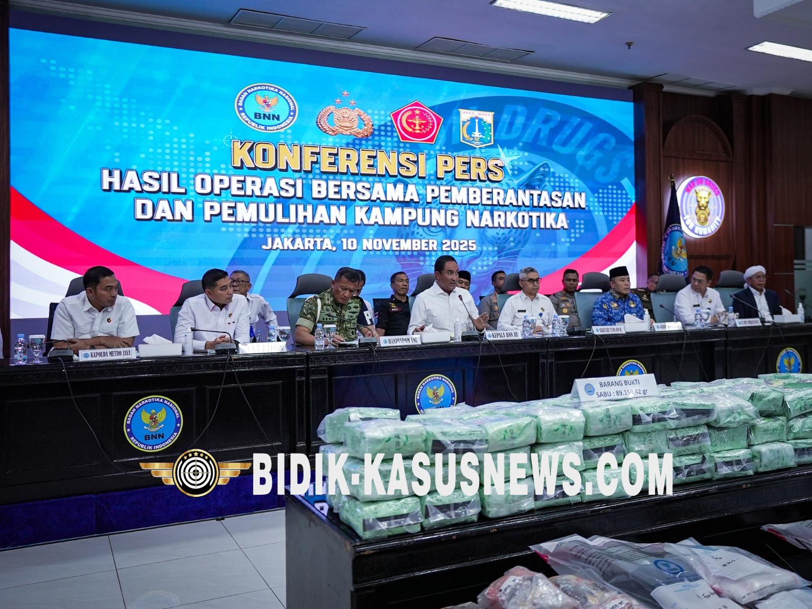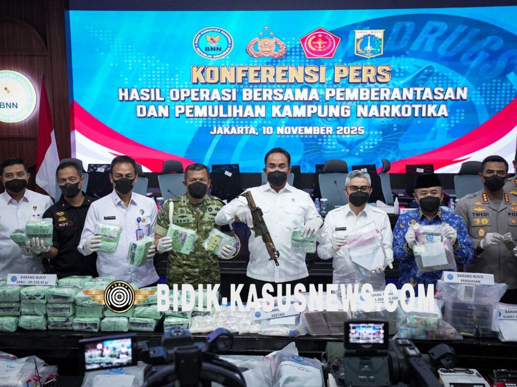 JAKARTA, BIDIK-KASUSNEWS.COM — Dalam operasi besar bertajuk “War on Drugs for Humanity”, Badan Narkotika Nasional (BNN) bersama Polri, TNI, dan pemerintah daerah berhasil mengungkap jaringan narkoba di berbagai wilayah Indonesia. Operasi Bersama Pemberantasan dan Pemulihan Kampung Narkoba yang digelar pada 5 hingga 7 November 2025 ini menjadi langkah nyata sinergi lintas sektor dalam mewujudkan Indonesia Bersih Narkoba (Bersinar).