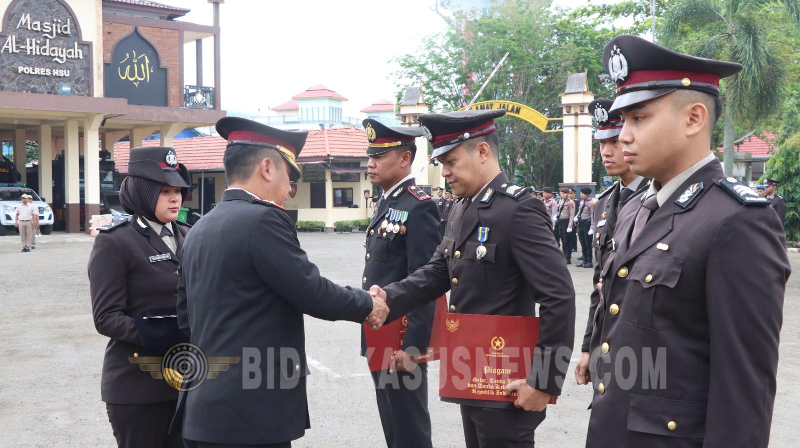 HSU, BIDIK-KASUSNEWS.COM – Kepolisian Resor Hulu Sungai Utara (HSU) menggelar upacara khidmat dalam rangka Penganugerahan Tanda Kehormatan kepada sejumlah personel yang telah menunjukkan loyalitas dan dedikasi luar biasa dalam menjalankan tugas kepolisian. Kegiatan ini dipusatkan di Halaman Mapolres HSU pada Senin (30/01/2026) pagi. Upacara yang dimulai tepat pukul 07.30 WITA tersebut dipimpin langsung oleh Kapolres HSU, AKBP Agus Nuryanto, S.I.K., M.Si. Turut hadir dalam barisan kehormatan yakni Wakapolres HSU, jajaran Pejabat Utama (PJU), para perwira, serta seluruh anggota Polri dan ASN di lingkungan Polres HSU. Sebanyak tujuh pleton pasukan disiagakan dalam upacara ini, meliputi Pleton PJU, Sat Samapta, Polair, Sat Lantas, ASN, hingga gabungan Sat Reskrim, Narkoba, dan Intelkam. Kehadiran pleton khusus penerima anugerah menjadi pusat perhatian sebagai bentuk penghormatan atas pengabdian mereka. Rangkaian acara diawali dengan laporan Komandan Upacara, dilanjutkan dengan kumandang lagu kebangsaan Indonesia Raya yang menambah suasana sakral di lapangan Mapolres. Momentum krusial terjadi saat pembacaan Surat Keputusan Presiden Republik Indonesia yang disusul dengan prosesi penyematan Tanda Kehormatan Satyalancana Pengabdian kepada perwakilan personel. Dalam amanatnya, Kapolres HSU AKBP Agus Nuryanto, S.I.K., M.Si., melalui Kasi Humas Polres HSU, Iptu Asep Hudzainur, menekankan bahwa tanda kehormatan ini bukanlah sekadar hiasan pada seragam, melainkan simbol tanggung jawab moral yang besar kepada negara dan masyarakat. “Bapak Kapolres menyampaikan ucapan selamat setinggi-tingginya kepada para personel yang menerima penganugerahan hari ini. Tanda Kehormatan Satyalancana Pengabdian ini merupakan bentuk apresiasi negara atas loyalitas, prestasi, dan pengabdian tanpa cacat yang telah diberikan oleh rekan-rekan selama bertugas di institusi Polri,” ujar Iptu Asep Hudzainur saat memberikan keterangan resmi. Lebih lanjut, Iptu Asep Hudzainur menambahkan pesan Kapolres agar penghargaan ini menjadi pelecut semangat bagi seluruh personel lainnya. “Penghargaan ini diharapkan mampu menjadi inspirasi bagi personel lain untuk senantiasa bekerja dengan hati, mengedepankan profesionalisme, dan menjaga integritas. Bapak Kapolres ingin agar setiap anggota Polres HSU terus memberikan pelayanan terbaik kepada masyarakat di wilayah hukum Hulu Sungai Utara, sehingga kepercayaan publik terhadap Polri semakin kuat,” pungkasnya. (Agus)