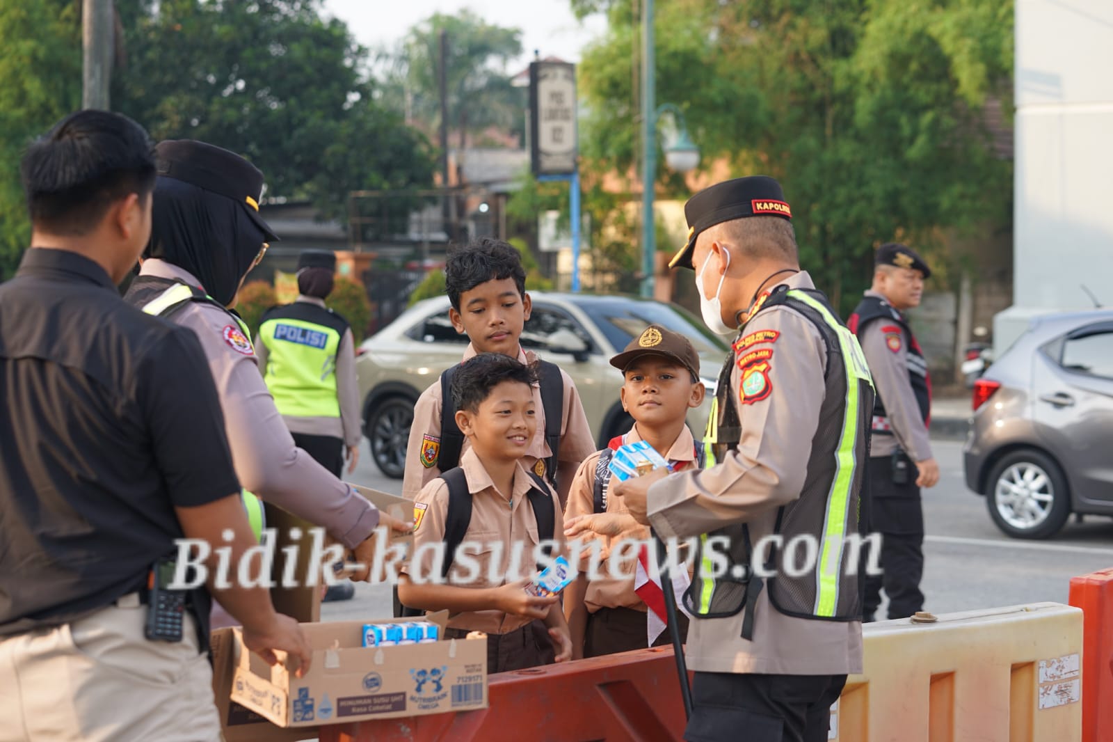 Bekasi, Bidik-kasusnews.com — Wujud kepedulian terhadap keselamatan dan kenyamanan masyarakat kembali ditunjukkan oleh jajaran Polres Metro Bekasi. Pagi ini, Kapolres Metro Bekasi Kombes Pol Mustofa memimpin langsung kegiatan Pelayanan Masyarakat (Yanmas) Pagi di Traffic Light Pos Lantas Jurong, Selasa (21/10/2025) sekitar pukul 06.30 WIB. Dalam kegiatan tersebut, Kapolres didampingi Kasat Samapta, Kasat Lantas, Kasi Humas, dan Kasi Propam Polres Metro Bekasi. Mereka turun langsung ke lapangan membantu masyarakat menyeberang jalan serta mengatur arus lalu lintas di tengah padatnya kendaraan pagi hari. Kombes Pol Mustofa juga menunjukkan sisi humanis dengan membagikan susu kotak kepada para pelajar yang tengah berangkat sekolah. Aksi sederhana namun bermakna ini mendapat sambutan hangat dari para siswa dan warga sekitar. “Kehadiran polisi di jalan bukan sekadar untuk menertibkan lalu lintas, tapi juga memberi rasa aman dan menjadi contoh positif bagi masyarakat, khususnya anak-anak yang merupakan generasi penerus bangsa,” ujar Kapolres. Kapolres menegaskan bahwa kegiatan Yanmas pagi ini merupakan bentuk nyata implementasi Polri Presisi yang menempatkan pelayanan masyarakat sebagai prioritas utama. Selain menciptakan keamanan dan ketertiban, kegiatan seperti ini juga memperkuat hubungan emosional antara polisi dan warga. Melalui kegiatan rutin seperti Yanmas Pagi, Polres Metro Bekasi berkomitmen untuk terus hadir di tengah masyarakat, baik dalam pelayanan lalu lintas maupun kegiatan sosial kemanusiaan. “Kami ingin masyarakat merasakan bahwa polisi adalah sahabat dan pelindung yang selalu hadir dengan hati. Kegiatan kecil seperti membantu penyeberangan dan berbagi susu ini adalah bagian dari upaya kami menanamkan nilai peduli dan aman sejak dini,” tambah Kombes Pol Mustofa. Kegiatan berlangsung aman dan lancar, dengan antusiasme tinggi dari masyarakat yang turut mengapresiasi langkah humanis Kapolres dan jajaran. Kehadiran polisi di pagi hari diharapkan dapat meningkatkan disiplin berlalu lintas sekaligus membangun citra positif Polri di mata masyarakat Kabupaten Bekasi. ( Agung)