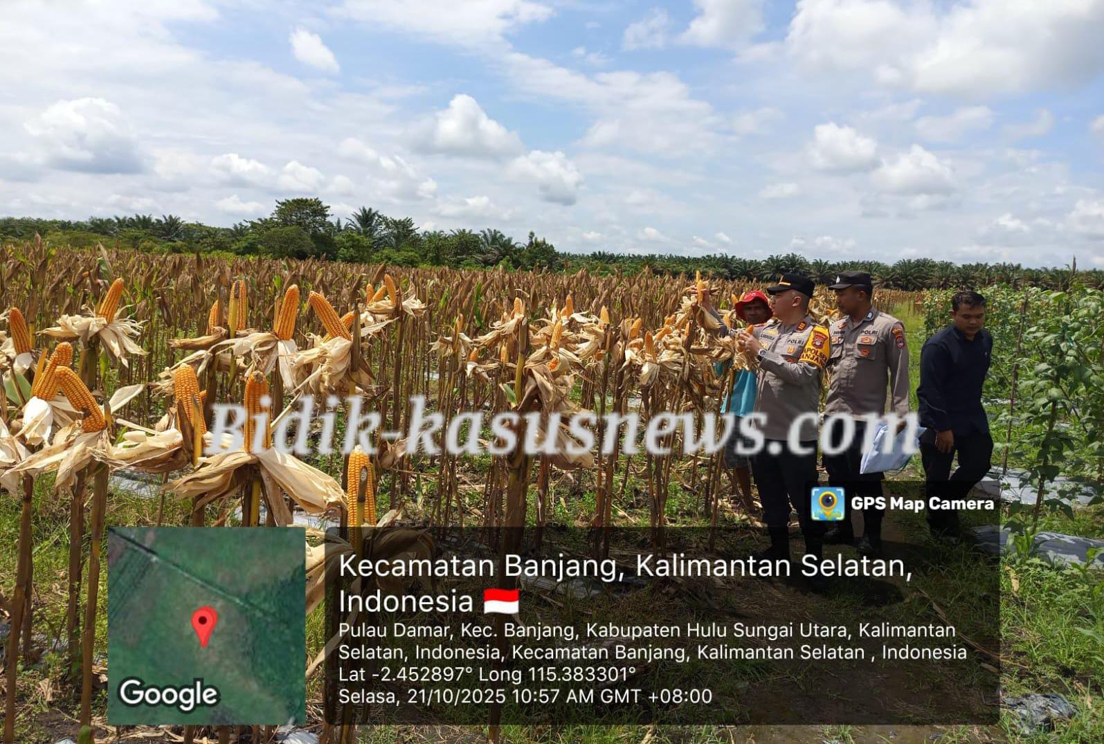 HSU, Bidik-kasusnews.com — Dalam upaya memperkuat program ketahanan pangan nasional dan meningkatkan produktivitas masyarakat di sektor pertanian, Polsek Banjang Polres Hulu Sungai Utara (HSU) melaksanakan kegiatan Panen Mandiri Jagung Jenis Pakan di Desa Pulau Damar, Kecamatan Banjang, Selasa (21/10/2025) pukul 10.00 WITA. Kegiatan ini dipimpin langsung oleh Kapolsek Banjang AKP Robby Ansharie Bahasuan, S.H., M.M., didampingi Kanit Turjawali Aiptu Soeyatmin, S.H., Kanit Reskrim Aipda Slamet Rianto, dan Bripka Danang Eko, S.H.. Seluruh personel Polsek turut membantu warga dalam proses panen dan pengeringan jagung di lahan milik warga setempat bernama Sadikin seluas 1,5 hektar. Jagung jenis Hibrida F1 tersebut ditanam pada 9 Juni 2025, dengan bantuan bibit dari Dinas Pertanian Kabupaten Hulu Sungai Utara sebanyak 40 bungkus. Saat ini, hasil panen sedang melalui proses pengeringan dengan kadar air mencapai sekitar 70 persen, sebelum dilakukan pemipilan. Diperkirakan, hasil produksi akan meningkat setelah tahap pengeringan selesai. Dalam kesempatan tersebut, Kapolsek Banjang AKP Robby Ansharie Bahasuan menyampaikan bahwa kegiatan panen mandiri ini merupakan bentuk dukungan nyata Polri terhadap kebijakan pemerintah dalam memperkuat ketahanan pangan. “Kami ingin menunjukkan bahwa Polri bukan hanya menjaga keamanan, tetapi juga berperan aktif dalam membantu masyarakat meningkatkan kesejahteraan ekonomi. Panen jagung ini menjadi contoh nyata sinergi antara aparat kepolisian dan warga dalam memanfaatkan potensi lahan pertanian,” ujarnya. Sementara itu, Kapolres Hulu Sungai Utara AKBP Agus Nuryanto, S.I.K., M.Si. melalui Kasi Humas IPTU Asep Hudzainur memberikan apresiasi atas inisiatif dan kepedulian jajaran Polsek Banjang dalam mendukung ketahanan pangan lokal. “Bapak Kapolres menyampaikan terima kasih dan penghargaan kepada jajaran Polsek Banjang yang aktif melaksanakan kegiatan produktif seperti ini. Upaya tersebut menjadi bukti bahwa Polri hadir di tengah masyarakat bukan hanya dalam aspek keamanan, tetapi juga pemberdayaan ekonomi,” tutur IPTU Asep. Ia menambahkan bahwa Kapolres HSU terus mendorong seluruh Polsek di jajaran untuk meniru langkah positif ini. “Melalui panen mandiri, diharapkan masyarakat semakin terdorong memanfaatkan lahan yang belum produktif. Ini sejalan dengan semangat Polri Presisi dalam mendukung kesejahteraan dan kemandirian masyarakat,” imbuhnya. Kegiatan panen yang berlangsung hingga pukul 11.45 WITA berjalan aman, tertib, dan lancar. Selain memberikan nilai ekonomi bagi warga, kegiatan ini juga menjadi simbol kuat sinergitas antara Polri, pemerintah daerah, dan petani dalam mewujudkan kemandirian pangan serta masyarakat yang tangguh dan sejahtera. ( Agus)
