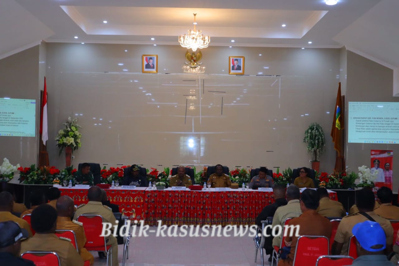 Puncak Jaya | Bidik-kasusnews.com – 23 September 2025 – Pemerintah Kabupaten Puncak Jaya menggelar rapat koordinasi untuk mempersiapkan kunjungan kerja Gubernur dan Wakil Gubernur Papua Tengah. Rapat yang dipimpin langsung oleh Bupati Puncak Jaya, Yuni Wanda, S.Sos., S.IP., M.M., berlangsung di Aula Kantor Bupati pada Selasa (23/9/2025). Dalam arahannya, Bupati menekankan bahwa kunjungan kerja ini harus disambut dengan baik oleh seluruh elemen masyarakat. Ia meminta para kepala distrik dan kepala desa berperan aktif mengajak warganya agar turut serta dalam menyambut kedatangan pimpinan daerah tersebut. “Kita harus menunjukkan kesiapan sebagai tuan rumah yang baik. Kunjungan ini penting bagi pembangunan di Puncak Jaya, sehingga semua perangkat daerah wajib mendukung,” tegas Bupati Yuni Wanda. Selain itu, Bupati menekankan pentingnya koordinasi antarinstansi, terutama terkait kebutuhan teknis dan logistik. Ia memastikan setiap perangkat daerah bertanggung jawab sesuai bidangnya agar kegiatan berlangsung tanpa hambatan. Dari sisi keamanan, Bupati menugaskan TNI-Polri, yang dipimpin oleh Dandim 1714/Puncak Jaya Letkol Inf. Bagus Kurniawan dan Kapolres Puncak Jaya, untuk menjaga jalannya agenda kerja Gubernur dan Wakil Gubernur mulai dari kedatangan hingga kepulangan. Dalam kesempatan tersebut, Dandim 1714/Puncak Jaya menegaskan kesiapan TNI mendukung penuh pengamanan bersama Polri. Ia juga mengajak para kepala desa dan masyarakat untuk turut berpartisipasi menjaga ketertiban. “TNI siap mendukung Polri dalam pengamanan. Kami berharap seluruh masyarakat dapat bekerja sama demi kelancaran kunjungan ini,” ujar Letkol Inf. Bagus Kurniawan. Menutup rapat, Bupati menyampaikan apresiasi kepada seluruh pihak yang terlibat. Ia menegaskan bahwa Pemerintah Kabupaten Puncak Jaya dan masyarakat siap menerima kunjungan kerja Gubernur dan Wakil Gubernur Papua Tengah dengan harapan membawa manfaat nyata bagi pembangunan daerah. Sinergi pemerintah daerah bersama TNI-Polri dalam persiapan ini diharapkan menjadi kunci sukses terlaksananya kunjungan kerja, sekaligus memperkuat pelayanan pemerintah terhadap masyarakat Puncak Jaya. ( Agus)