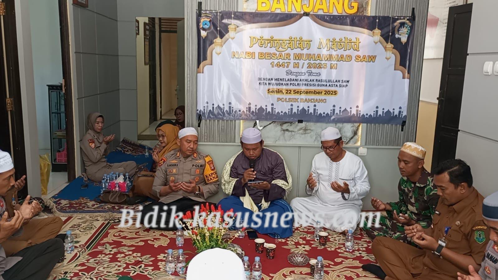Balangan | Bidik-kasusnews.com – Dalam rangka memperingati Maulid Nabi Besar Muhammad SAW 1447 H, Polsek Banjang menggelar acara keagamaan di halaman Mapolsek Banjang, Senin (22/9/2025) pagi. Kegiatan ini dihadiri jajaran Forkopimcam, tokoh agama, tenaga kesehatan, hingga Bhayangkari Polsek Banjang. Acara yang dimulai sekitar pukul 08.00 WITA tersebut menghadirkan Ustadz Syarwani Abdan, Pimpinan Majelis Ta’lim Ahlul Kisa, sebagai penceramah utama. Hadir pula Camat Banjang Rully Lesmana, S.S.ST.P., M.AP, Kapolsek Banjang AKP Robby Ansharie Bahasuan, SH., MM, Kepala Puskesmas Banjang A. Rifani, SKM., MM, serta perwakilan Danramil Amuntai Tengah–Banjang. Susunan Acara Rangkaian peringatan Maulid diawali dengan pembukaan, lantunan syair-syair maulid, dan pembacaan ayat suci Al-Qur’an oleh Ustadz Hajairin. Dilanjutkan sambutan Kapolsek Banjang selaku panitia pelaksana, ceramah agama oleh Ustadz Syarwani Abdan, dan ditutup dengan doa bersama. Pesan Ceramah Dalam tausyiahnya, Ustadz Syarwani Abdan menekankan bahwa peringatan Maulid Nabi Muhammad SAW bukan hanya sekadar seremonial, melainkan momentum penting untuk meneladani akhlak mulia Rasulullah dan keluarganya. “Maulid adalah kesempatan untuk merefleksikan nilai-nilai kehidupan yang diwariskan Rasulullah. Jika kita menghayati dan menerapkannya, maka akan menjadi pedoman dalam menghadapi tantangan hidup, termasuk dalam menjaga keharmonisan keluarga dan masyarakat modern,” ungkapnya. Suasana Penuh Kebersamaan Acara berlangsung khidmat dan penuh kebersamaan. Lantunan salawat dan doa-doa menambah suasana religius di lingkungan Mapolsek Banjang. Panitia menyampaikan bahwa kegiatan ini tidak hanya memperkuat ukhuwah Islamiyah, tetapi juga semakin mendekatkan jajaran kepolisian dengan masyarakat. Kapolsek Banjang, AKP Robby Ansharie Bahasuan, menyampaikan apresiasi atas partisipasi semua pihak. “Semoga melalui peringatan Maulid Nabi Muhammad SAW ini, kita dapat semakin meningkatkan keimanan dan ketakwaan serta mempererat silaturahmi antara Polri, pemerintah, dan masyarakat,” ujarnya. Kondisi Aman dan Lancar Selama kegiatan, situasi berlangsung aman, tertib, dan lancar. Pihak Polsek Banjang memastikan bahwa acara berjalan sesuai rencana tanpa kendala berarti. Peringatan Maulid Nabi Muhammad SAW di Mapolsek Banjang ini sekaligus menjadi pengingat pentingnya menanamkan nilai-nilai keteladanan Rasulullah dalam kehidupan sehari-hari, baik di lingkungan keluarga, pekerjaan, maupun masyarakat luas. ( Agus)