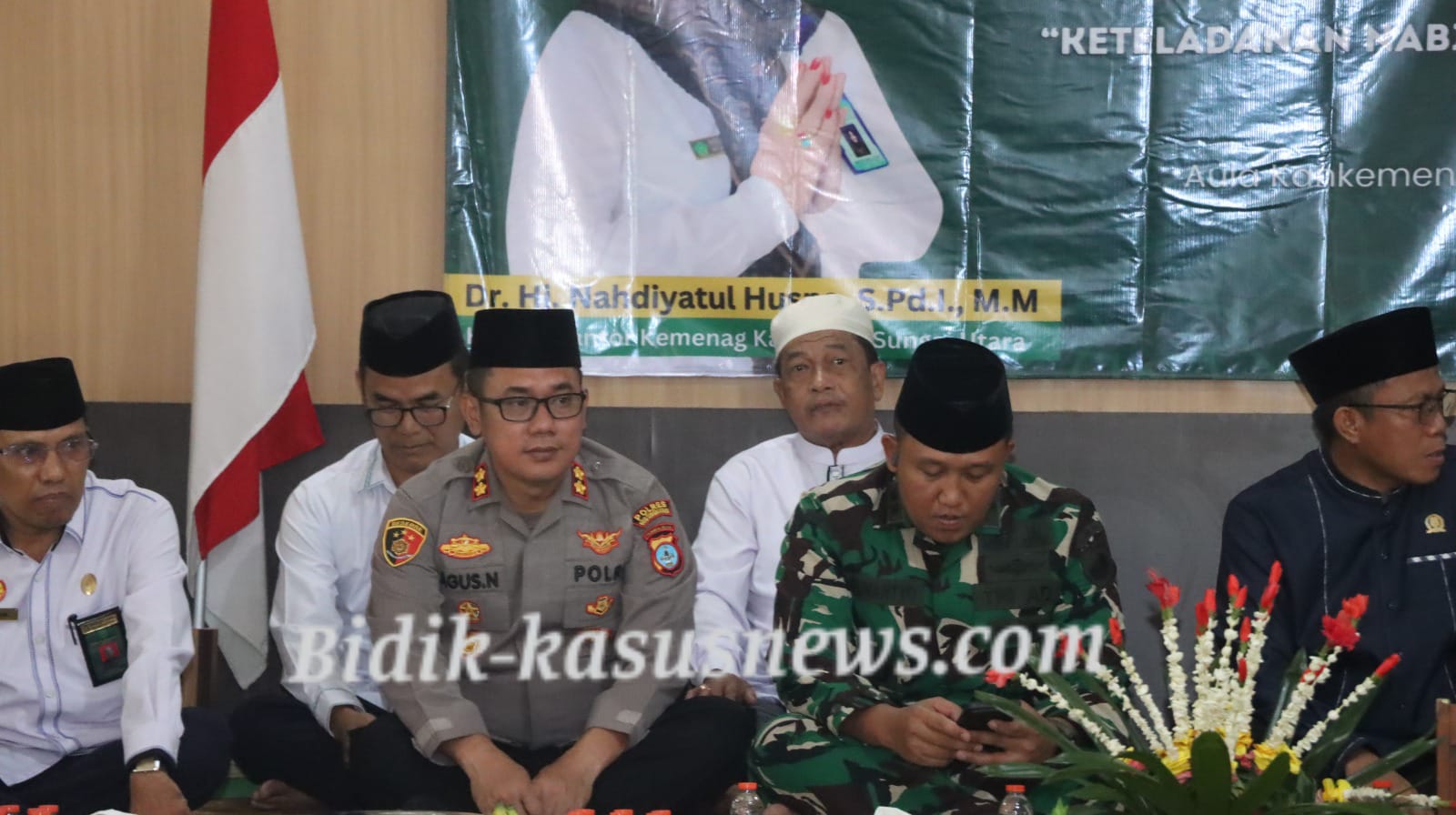 Amuntai | Bidik-kasusnews.com – Dalam rangka memperingati Maulid Nabi Besar Muhammad SAW 1447 Hijriah/2025 Masehi, Kantor Kementerian Agama Kabupaten Hulu Sungai Utara (HSU) menggelar acara keagamaan yang berlangsung khidmat pada Senin (22/9/2025). Acara yang dimulai sejak pukul 09.00 WITA ini turut dihadiri Kapolres HSU AKBP Agus Nuryanto, S.I.K., M.Si., Kasat Binmas AKP Syaifullah, S.H., beserta anggota Polres HSU. Kehadiran jajaran kepolisian ini menjadi bentuk dukungan terhadap kegiatan keagamaan sekaligus sarana mempererat hubungan silaturahmi dengan masyarakat. Kegiatan peringatan Maulid Nabi tahun ini diawali dengan pembacaan ayat suci Al-Qur’an, dilanjutkan dengan lantunan shalawat dan ceramah agama yang mengupas keteladanan Rasulullah Muhammad SAW sebagai suri teladan umat Islam. Penceramah menekankan pentingnya meneladani akhlak mulia Nabi dalam kehidupan sehari-hari, baik dalam keluarga, lingkungan kerja, maupun bermasyarakat. Kapolres HSU menyampaikan apresiasinya atas terselenggaranya acara yang berlangsung aman, tertib, dan penuh kekhidmatan. Ia menegaskan bahwa peringatan Maulid Nabi bukan hanya seremonial, tetapi juga momentum untuk memperkuat iman, mempererat persaudaraan, serta memperkokoh persatuan di tengah masyarakat. “Semoga dengan peringatan Maulid Nabi ini, kita semakin mampu meneladani akhlak Rasulullah dalam menjaga persatuan dan kedamaian, khususnya di Kabupaten HSU,” ujar Kapolres. Acara kemudian ditutup dengan doa bersama yang dipimpin oleh tokoh agama setempat. Seluruh rangkaian kegiatan berjalan dengan aman dan lancar hingga selesai. ( Agus)