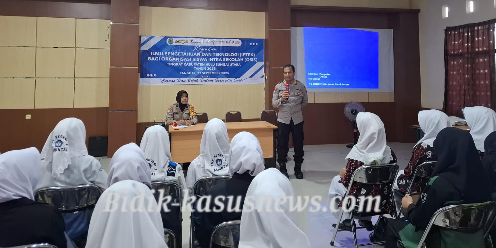 Amuntai, HSU | Bidik-kasusnews.com – Polres Hulu Sungai Utara (HSU) melalui Satuan Binmas melaksanakan kegiatan penyuluhan hukum dengan menjadi narasumber dalam sosialisasi Undang-Undang Informasi dan Transaksi Elektronik (UU ITE) kepada para Ketua OSIS se-Kabupaten HSU. Acara berlangsung di Aula Dispora Kabupaten HSU, Rabu (17/9/2025) siang. Kegiatan ini digelar sebagai bentuk edukasi sekaligus pencegahan dini terhadap potensi penyalahgunaan media sosial, terutama pasca terjadinya unjuk rasa anarkis di beberapa daerah yang dipicu oleh informasi hoaks dan ujaran provokatif di dunia maya. Hadir sebagai pemateri, Kasat Binmas Polres HSU AKP Syaifullah, S.H., didampingi oleh sejumlah personel, di antaranya Aipda Irma Fitri H, Brigadir Ratna Eka Syafitri, Briptu Adi Rizki Putra, Briptu M. Ahlun Nazhar, S.Pd., M.M., serta Bripda Ahmad Hasan. Dalam penyampaiannya, AKP Syaifullah menegaskan pentingnya pemahaman UU ITE bagi generasi muda, khususnya pelajar yang aktif menggunakan media sosial. Ia mengingatkan agar bijak dalam menyaring informasi dan tidak mudah terprovokasi. “Adik-adik pelajar adalah calon pemimpin bangsa. Jangan sampai masa depan terhambat karena terjerat kasus hukum akibat penyalahgunaan media sosial. Mari gunakan teknologi untuk hal positif dan membangun,” ujarnya. Kegiatan berlangsung interaktif dengan sesi tanya jawab antara narasumber dan peserta. Para Ketua OSIS tampak antusias mengikuti diskusi dan menyampaikan berbagai pertanyaan terkait penggunaan media sosial yang sehat serta cara menangkal berita bohong. Kapolres HSU menyampaikan bahwa kegiatan edukasi seperti ini akan terus digelar untuk meningkatkan literasi digital di kalangan pelajar sekaligus mencegah terulangnya aksi anarkis akibat provokasi di dunia maya. Acara berakhir dengan tertib, aman, dan lancar. Para peserta berharap materi yang disampaikan dapat menjadi bekal dalam mengedukasi rekan-rekan pelajar di sekolah masing-masing agar lebih bijak dalam bermedia sosial. ( Agus)