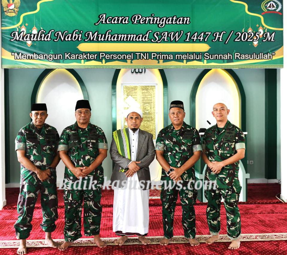 Jakarta | Bidik-kasusnews.com – Pusat Teritorial Angkatan Darat (Pusterad) memperingati Maulid Nabi Muhammad SAW 1447 H/2025 M dengan tema “Membangun karakter Personel TNI PRIMA melalui sunnah Rasulullah”, Rabu, 17 September 2025, di Masjid Al-Ikhlas Mapusterad, Jakarta Timur. Kegiatan ini diikuti seluruh Prajurit TNI, PNS, serta anggota Persit Kartika Chandra Kirana PCBS Pusterad. Suasana pagi yang sejuk menyelimuti Mapusterad. Para prajurit, PNS, dan anggota Persit memenuhi halaman masjid dengan semangat kebersamaan. Sapaan hangat dan senyum tulus antarhadirin menegaskan ikatan kekeluargaan yang kuat, seakan seluruh hati bersatu dalam satu tujuan: meneladani akhlak Rasulullah SAW dan menerapkannya dalam pengabdian kepada bangsa dan negara. Peringatan Maulid bukan sekadar ritual tahunan, melainkan momentum spiritual yang mendalam. Sifat shiddiq, amanah, fathonah, dan tabligh menjadi pedoman moral yang membimbing setiap prajurit untuk menjalankan tugas dengan ikhlas. Nilai-nilai ini juga menjadi fondasi pembangunan karakter PRIMA (Profesional, Responsif, Integratif, Modern, dan Adaptif) yang menjadi ciri khas anggota Pusterad. Kehadiran KH. Dede Abdurrahman dari Pondok Pesantren Ta’fidz Qur’an Al-Ikhlas Nizamuddin menambah dimensi spiritual acara. Tausiah beliau mengingatkan pentingnya iman, akhlak mulia, dan pengabdian sepenuh hati demi kemaslahatan bangsa. Para peserta tampak khusyuk, merenungkan pesan yang disampaikan, sehingga semangat pengabdian dan kesadaran moral semakin menyala. Momen Maulid juga menjadi ruang refleksi bagi anggota Persit. Kehangatan kebersamaan, keikhlasan, dan keteladanan memperkuat ikatan antara prajurit dan keluarga besar Pusterad. Setiap senyum, sapaan, dan shalawat yang dilantunkan menyalakan kembali semangat untuk menjaga persatuan bangsa dengan cinta, keteguhan, dan kepedulian tulus. Di balik kesederhanaan acara, tersimpan pesan besar: keteladanan Rasulullah SAW menjadi lentera pengabdian yang hidup dalam hati setiap prajurit dan Persit Pusterad. Spiritualitas dan profesionalisme berpadu, sehingga setiap langkah pengabdian tidak hanya berhasil secara tugas, tetapi juga bernilai keberkahan bagi diri, keluarga, masyarakat, dan bangsa. Peringatan Maulid ini menunjukkan bahwa meneladani Rasulullah tidak hanya menguatkan iman, tetapi juga membimbing setiap anggota Pusterad untuk melayani bangsa dengan sepenuh hati, demi Indonesia yang lebih sejahtera, harmonis, dan bermartabat.( Agus)