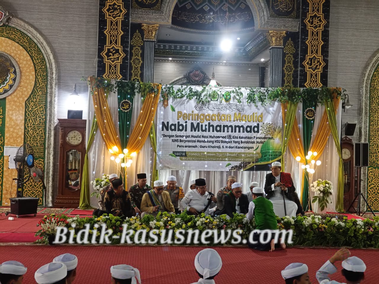 HSU | Bidik-kasusnews.com – Peringatan Maulid Nabi Besar Muhammad SAW 1447 H digelar dengan penuh khidmat di Masjid Abu Sofyan Pondok Pesantren (Ponpes) IUNS, Desa Kaludan Kecil, Kecamatan Banjang, Kabupaten Hulu Sungai Utara (HSU), Kamis (18/9/2025). Acara keagamaan ini dihadiri ratusan jamaah, para alim ulama, tokoh masyarakat, hingga unsur TNI-Polri. Kegiatan yang dimulai sejak pukul 09.00 Wita tersebut menghadirkan penceramah KH. Ahmad Khairazi, Pimpinan Majelis Raudatul Ghanna An Nabiyah. Dalam tausiyahnya, beliau menekankan pentingnya meneladani akhlak Nabi Muhammad SAW dalam kehidupan sehari-hari. “Maulid Nabi bukan hanya sekadar perayaan tahunan. Lebih dari itu, ini adalah momentum refleksi untuk meneladani sifat Rasulullah yang jujur, amanah, dan penuh kasih sayang,” ujar KH. Ahmad Khairazi dalam ceramahnya. Hadir dalam kegiatan tersebut antara lain Kapolsek Banjang AKP Robby Ansharie Bahasuan, SH, MM, perwakilan Danramil, Kasat Binmas Polres HSU, pimpinan Ponpes IUNS H. Hendra Mahmunah Jaya, serta sejumlah tokoh agama dari HSU dan sekitarnya. Tidak kurang dari 300 santri dan warga sekitar turut menyemarakkan acara tersebut. Rangkaian kegiatan diawali dengan pembacaan ayat suci Al-Qur’an oleh santri SMP, dilanjutkan dengan sambutan pimpinan Ponpes IUNS, lantunan syair-syair maulid oleh grup Alhabsy, hingga doa penutup. Kapolsek Banjang AKP Robby Ansharie Bahasuan menegaskan bahwa Polsek Banjang turut melakukan pengamanan demi kelancaran acara. “Alhamdulillah, seluruh rangkaian kegiatan peringatan Maulid Nabi berlangsung aman, tertib, dan lancar,” ujarnya. Peringatan Maulid Nabi Muhammad SAW 1447 H di Ponpes IUNS Banjang ini tidak hanya menjadi ajang mempererat tali silaturahmi, tetapi juga momentum untuk menggali kembali nilai-nilai luhur Rasulullah sebagai pedoman hidup di tengah tantangan zaman modern. ( Agus)