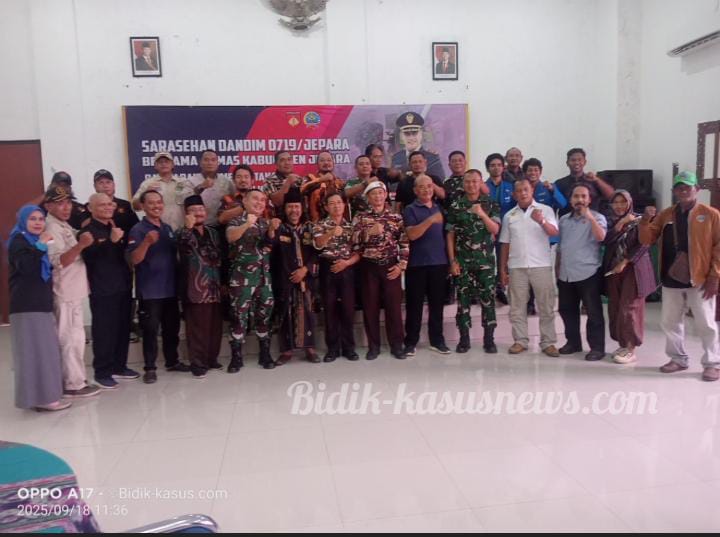 JATENG:Bidik-kasusnews.com Jepara – Semangat persatuan tampak begitu terasa dalam kegiatan sarasehan yang digelar Kodim 0719/Jepara bersama organisasi kemasyarakatan (Ormas) se-Kabupaten Jepara, Kamis (18/9/2025). Bertempat di Aula Makodim, forum ini menjadi ruang pertemuan sekaligus penguat komitmen bersama menjaga kondusifitas wilayah. Dipimpin langsung oleh Komandan Kodim 0719/Jepara, Letkol Arm Khoirul Cahyadi, S.E., sarasehan ini menghadirkan berbagai ormas dari beragam latar belakang. Kehadiran mereka menjadi bukti bahwa rasa cinta terhadap Jepara mampu menyatukan perbedaan. Dalam sambutannya, Dandim menekankan bahwa keamanan bukan semata tugas aparat, melainkan tanggung jawab bersama. “Kekuatan Jepara ada pada kebersamaan warganya. TNI tidak bisa bekerja sendiri, kita harus bergandengan tangan. Perbedaan itu anugerah, bila dikelola dengan baik justru akan memperkuat kita,” tegas Letkol Arm Khoirul Cahyadi. Sejumlah ormas hadir dalam kesempatan itu, di antaranya Pro Grib, Grib Jaya, LSM GMBI, Pemuda Pancasila, Squad Nusantara, Aji Cakra, Pekad IB, PKN JU, KPPI, Ormas Kesenian, serta Lembaga Jepara Maju (LJM). Diskusi berlangsung dalam suasana akrab dan penuh keterbukaan. Perwakilan ormas menyampaikan dukungan mereka untuk TNI, sekaligus memberi masukan terkait dinamika sosial yang muncul di masyarakat. Bagi Kodim 0719/Jepara, sarasehan ini merupakan wujud nyata Bakti Teritorial Prima—sebuah pendekatan yang menempatkan TNI sebagai sahabat rakyat, pengayom, sekaligus penghubung yang menguatkan sinergi antara aparat dan masyarakat. Menutup kegiatan, Dandim menyampaikan harapannya agar forum semacam ini terus berlanjut. > “Kami ingin Jepara menjadi rumah yang damai bagi semua. Dengan komunikasi yang baik, kita bisa mencegah gesekan, sekaligus membangun Jepara yang bermartabat,” pungkasnya. (Wely-jateng)