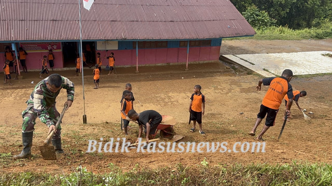 Boven Digoel, Bidik-kasusnews.com – Tentara Nasional Indonesia (TNI) dari Satgas Pamtas RI-PNG Yonif 126/Kalacakti menggelar karya bakti bersama guru dan siswa SD Negeri Persiapan Amupkim di wilayah perbatasan, Jumat (12/9/2025). Kegiatan ini bertujuan menciptakan lingkungan sekolah yang bersih, nyaman, serta mendukung proses belajar-mengajar. Karya bakti terpadu tersebut difokuskan pada pembersihan area sekolah dengan melibatkan partisipasi aktif seluruh siswa, para guru, serta prajurit TNI. Suasana gotong royong terasa hangat, diwarnai semangat kebersamaan antara TNI dan masyarakat. Sebagai bentuk kedekatan dengan anak-anak, personel Satgas turut membagikan permen kepada siswa usai kegiatan. Aksi sederhana ini mendapat sambutan meriah dan menambah keceriaan di lingkungan sekolah. Salah seorang guru, Yosepa Konamot, menyampaikan apresiasinya terhadap kepedulian Satgas TNI. “Kami sangat berterima kasih atas dukungan dan perhatian TNI, yang tidak hanya menjaga perbatasan tetapi juga peduli terhadap dunia pendidikan,” ucapnya. Komandan Pos Tembutka menegaskan bahwa karya bakti tersebut merupakan wujud nyata implementasi tugas pokok TNI di perbatasan. “Kami hadir bukan hanya untuk menjaga kedaulatan negara, tetapi juga menjadi mitra masyarakat dalam pembangunan, khususnya mendukung generasi muda sebagai penerus bangsa,” tegasnya. Kegiatan karya bakti ini diharapkan semakin mempererat hubungan harmonis antara TNI dan masyarakat. Sinergi antara unsur pertahanan dan pendidikan dinilai penting untuk memperkuat ketahanan nasional sejak dini, terutama di daerah perbatasan yang penuh dengan tantangan. ( Agus)
