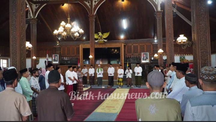 JATENG:Bidik-kasusnews.com Jepara – 7 September 2025 | Suasana khusyuk menyelimuti Pendapa Kartini Kabupaten Jepara saat pengajian rutin Ahad Pahing kembali digelar pada Ahad (7/9/2025). Ratusan jamaah tampak larut dalam lantunan selawat dan dzikir yang dipimpin Jamaah Kiai Mojo. Kegiatan yang sudah menjadi agenda tetap Pemkab Jepara ini dihadiri langsung oleh Bupati Jepara H. Witiarso Utomo, Wakil Bupati M. Ibnu Hajar, Sekda Ary Bachtiar, serta sejumlah pejabat daerah dan tokoh agama. Dalam sambutannya, Wakil Bupati Ibnu Hajar mengajak jamaah untuk menjadikan dzikir dan shalawat sebagai benteng spiritual bagi Jepara. Ia menekankan bahwa doa masyarakat sangat penting agar Jepara senantiasa terjaga dari berbagai musibah maupun konflik sosial. > “Dzikir dan doa panjenengan adalah kekuatan yang menjaga Jepara. Mari bersama-sama kita rawat kerukunan dan kondusivitas daerah kita,” ungkapnya. Selain itu, Gus Hajar juga menyoroti peran keluarga dalam membentuk generasi penerus yang berakhlak mulia. Ia berpesan agar para ibu tidak lelah menanamkan nilai-nilai kebaikan sejak dini. > “Ibu-ibu adalah sekolah pertama bagi anak-anaknya. Jika sejak awal mereka dibimbing dengan kebaikan, insyaallah Jepara akan memiliki generasi unggul,” tegasnya. Lebih jauh, ia menambahkan bahwa semangat kebersamaan harus dijaga seluruh lapisan masyarakat. Saling membantu, tidak terpecah belah, dan menumbuhkan solidaritas adalah kunci agar Jepara tetap menjadi daerah yang makmur, religius, dan lestari. Di akhir acara, seluruh jamaah bersama-sama memanjatkan doa untuk keselamatan dan keberkahan Kabupaten Jepara. Tradisi pengajian Ahad Pahing ini diharapkan terus berlangsung rutin sebagai wadah spiritual sekaligus perekat kebersamaan masyarakat. (Wely-jateng) Sumber: Diskominfo jepara