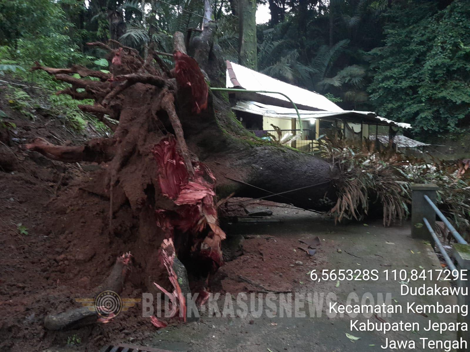 JATENG:Bidik-kasusnews.com Jepara – Sebuah pohon tua berusia ratusan tahun tumbang akibat hujan disertai angin kencang yang melanda wilayah Kecamatan Kembang, Kabupaten Jepara. Peristiwa tersebut terjadi pada Jumat dini hari, 16 Januari 2026, sekitar pukul 01.00 WIB. Carek (Carik) Desa Dudakawu menyampaikan kepada Bidik-kasusnews melalui pesan WhatsApp pada Jumat (16/1/2026) bahwa pohon tumbang tersebut berada di kawasan Sendang Sinatah, tepatnya di Desa Dudakawu RT 04 RW 03, Kecamatan Kembang. “Pohon tumbang terjadi akibat hujan angin yang cukup lebat. Selain faktor cuaca, usia pohon yang sudah ratusan tahun juga menjadi penyebab utama,” ungkapnya. Beruntung, dalam kejadian tersebut tidak dilaporkan adanya korban jiwa. Namun, pohon tumbang sempat mengganggu akses di sekitar lokasi sendang dan menimbulkan kekhawatiran warga, mengingat Sendang Sinatah merupakan salah satu tempat yang sering dikunjungi masyarakat. Pemerintah Desa Dudakawu bersama warga setempat segera melakukan langkah penanganan awal dengan membersihkan area sekitar dan mengamankan lokasi guna mencegah risiko lanjutan, terutama saat cuaca ekstrem masih berpotensi terjadi. Pihak desa juga mengimbau masyarakat untuk meningkatkan kewaspadaan terhadap cuaca ekstrem, khususnya saat hujan deras dan angin kencang, serta menghindari area yang terdapat pohon tua atau rawan tumbang. (Wely-jateng)
