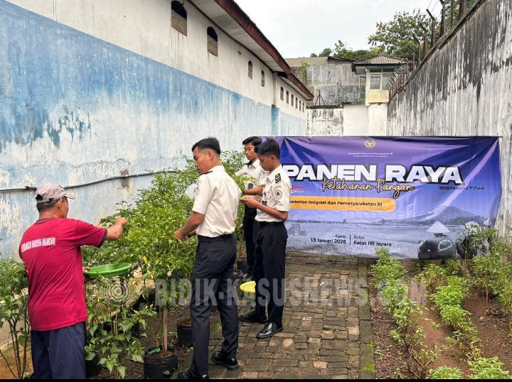 JATENG:Bidik-kasusnews.com Jepara – Rumah Tahanan Negara (Rutan) Kelas IIB Jepara menunjukkan peran aktifnya dalam mendukung ketahanan pangan nasional melalui partisipasi pada Panen Raya Serentak Pemasyarakatan yang digelar secara nasional, Kamis (15/1/2026). Kegiatan nasional tersebut dipusatkan di Lembaga Pemasyarakatan Cirebon, Jawa Barat, dan diikuti oleh seluruh satuan kerja pemasyarakatan di Indonesia. Di Rutan Jepara, panen raya dilaksanakan di area pertanian terbatas yang dikelola secara mandiri. Meski dengan kondisi lahan yang tidak luas, Rutan Jepara berhasil memanen komoditas cabai sebagai hasil dari program pembinaan kemandirian bagi warga binaan. Kegiatan panen dipimpin oleh Kepala Kesatuan Pengamanan Rutan Jepara, Benny Apridona, bersama jajaran pegawai serta peserta magang dari Kementerian Ketenagakerjaan. Seluruh peserta terlibat langsung dalam proses panen, mencerminkan semangat kebersamaan dan produktivitas di lingkungan pemasyarakatan. Menurut Benny Apridona, program pertanian ini tidak hanya bertujuan menghasilkan produk pangan, tetapi juga membekali warga binaan dengan keterampilan yang dapat dimanfaatkan setelah selesai menjalani masa pidana. “Melalui kegiatan pertanian ini, warga binaan dilatih untuk mandiri, disiplin, dan produktif. Ini menjadi bekal penting bagi mereka saat kembali ke masyarakat,” jelasnya. Ia menambahkan, partisipasi dalam panen raya serentak menjadi bukti bahwa pemasyarakatan mampu berkontribusi nyata dalam program nasional, khususnya di bidang ketahanan pangan. Dengan terlaksananya Panen Raya Serentak Pemasyarakatan, Rutan Jepara menegaskan komitmennya sebagai institusi pembinaan yang tidak hanya berorientasi pada keamanan, tetapi juga pada pemberdayaan dan kemanfaatan sosial. Program ini diharapkan terus berlanjut dan memberikan dampak positif bagi warga binaan serta masyarakat luas. (Wely-jateng) Sumber;Humas Rutan jepara