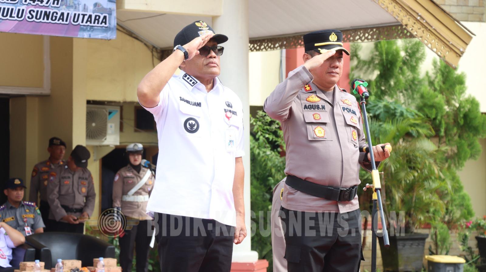 Amuntai | Bidik-kasusnews.com – Dalam rangka memastikan kesiapan pengamanan kegiatan keagamaan berskala besar, Polres Hulu Sungai Utara (HSU) menggelar Apel Gelar Pasukan Pengamanan Momen 21 Rajab 1447 Hijriah atau Haul Abah Guru Danau ke-2 Tahun 2026, Rabu (7/1/2026). Apel berlangsung di Halaman Pemerintah Daerah Kabupaten HSU, Kelurahan Murung Sari, Kecamatan Amuntai Tengah. Apel kesiapan tersebut dipimpin langsung oleh Kapolres Hulu Sungai Utara AKBP Agus Nuryanto, S.I.K., M.Si., serta dihadiri unsur Forkopimda Kabupaten HSU, jajaran TNI, Brimob Polda Kalimantan Selatan, Satpol PP, Dinas Perhubungan, BPBD, Dinas Pemadam Kebakaran, hingga personel Bantuan Kendali Operasi (BKO) dari sejumlah Polres di wilayah Kalimantan Selatan. Sebanyak kurang lebih 350 personel gabungan diterjunkan dalam apel tersebut. Mereka terdiri dari berbagai satuan tugas, di antaranya pleton gabungan Reskrim dan Intelijen, Satlantas, Satpolairud, Satsamapta, Satpol PP, Dishub, pleton BKO dari Polres Hulu Sungai Tengah, Hulu Sungai Selatan, Balangan, Tabalong, Tapin, serta personel Brimob Polda Kalsel Batalyon C Pelopor lengkap dengan tim siaga SAR. Kapolres HSU AKBP Agus Nuryanto dalam amanatnya menegaskan bahwa pengamanan kegiatan Haul Abah Guru Danau merupakan tugas penting yang membutuhkan kesiapan maksimal dan sinergi lintas instansi. Menurutnya, haul bukan hanya agenda rutin keagamaan, tetapi juga kegiatan masyarakat yang melibatkan ribuan jamaah dari berbagai daerah. “Pengamanan ini bukan sekadar rutinitas, melainkan bentuk pengabdian Polri kepada masyarakat. Laksanakan tugas dengan penuh tanggung jawab, profesional, dan tetap mengutamakan keselamatan jamaah,” tegas Kapolres. Kapolres juga menekankan pentingnya pendekatan humanis dalam bertugas. Seluruh personel diminta mengedepankan sikap santun, membantu masyarakat, serta memberikan pelayanan terbaik selama rangkaian kegiatan haul berlangsung. Pernyataan resmi Kapolres disampaikan melalui IPTU Asep Hudzainur yang menjelaskan bahwa Apel Gelar Pasukan digelar untuk memastikan kesiapan operasional pengamanan momen 21 Rajab. “Kami ingin masyarakat merasa aman dan nyaman dalam mengikuti rangkaian haul. Seluruh aspek pengamanan telah dipersiapkan, mulai dari pengaturan lalu lintas, pengamanan lokasi, hingga patroli di wilayah perairan,” ujarnya. Usai pelaksanaan apel, kegiatan dilanjutkan dengan Tactical Floor Game (TFG) yang dipimpin Kapolres HSU bersama unsur Forkopimda dan instansi terkait. Dalam kegiatan tersebut dibahas secara detail skema pengamanan, rekayasa lalu lintas, pola pengamanan terbuka dan tertutup, serta mekanisme koordinasi antarinstansi guna mengantisipasi berbagai potensi gangguan kamtibmas. Melalui kegiatan ini, Polres Hulu Sungai Utara mengimbau masyarakat untuk turut berperan menjaga ketertiban dengan mematuhi arahan petugas dan mengikuti pengaturan lalu lintas yang telah ditetapkan. Polres HSU berkomitmen memberikan pengamanan maksimal demi terciptanya situasi yang aman, tertib, dan kondusif selama pelaksanaan Haul Abah Guru Danau 21 Rajab 1447 Hijriah. (Agus)