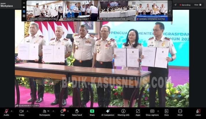 JATENG:Bidik-kasusnews.com Jepara, 5 Januari 2026 – Rumah Tahanan Negara (Rutan) Kelas IIB Jepara turut berpartisipasi dalam Apel Pegawai Awal Tahun 2026 yang diselenggarakan oleh Kementerian Imigrasi dan Pemasyarakatan. Kegiatan ini dilaksanakan secara terpusat dan diikuti oleh seluruh satuan kerja di lingkungan Kementerian Imigrasi dan Pemasyarakatan, termasuk jajaran Rutan Kelas IIB Jepara yang mengikuti kegiatan tersebut melalui Zoom Meeting dari tempat tugas masing-masing. Apel Pegawai Awal Tahun 2026 ini dilanjutkan dengan Deklarasi Janji Kinerja Tahun 2026 sebagai bentuk komitmen seluruh jajaran dalam meningkatkan kinerja, profesionalisme, serta akuntabilitas pelaksanaan tugas dan fungsi di bidang imigrasi dan pemasyarakatan. Deklarasi tersebut menjadi penegasan komitmen bersama dalam mewujudkan tata kelola pemerintahan yang baik serta pelayanan publik yang berintegritas. Rangkaian kegiatan kemudian dilanjutkan dengan penandatanganan Perjanjian Kinerja Tahun 2026 antara Kantor Wilayah Direktorat Jenderal Imigrasi dan Kantor Wilayah Direktorat Jenderal Pemasyarakatan. Penandatanganan perjanjian kinerja ini dilaksanakan secara virtual melalui Zoom Meeting dan bertujuan untuk memperkuat sinergi, meningkatkan efektivitas pelaksanaan program kerja, serta memastikan pencapaian target kinerja yang telah ditetapkan pada tahun 2026.(Wely-jateng) Sumber:humas Rutan jepara