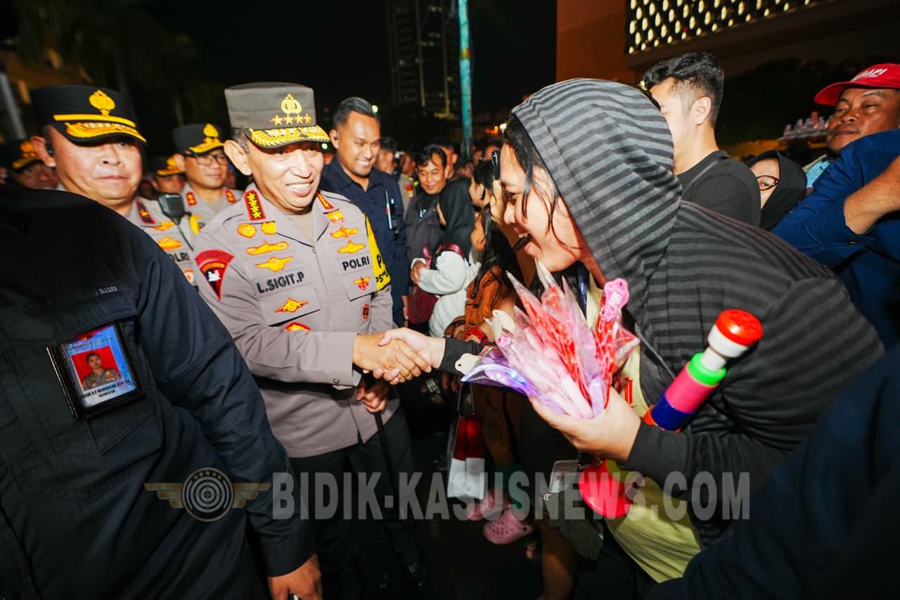JAKARTA, BIDIK-KASUSNEWS.COM – Kapolri Jenderal Listyo Sigit Prabowo turun langsung ke Bundaran Hotel Indonesia (HI) untuk mengecek langsung pengamanan personel kepolisian terkait dengan perayaan malam Tahun Baru 2026. Sigit langsung turun ke Bundaran HI yang merupakan salah satu titik pusat perayaan Tahun Baru 2026 yang dihadiri banyak masyarakat, khususnya Jakarta dan sekitarnya. Di lokasi tersebut, diselenggarakan doa bersama lintas agama, panggung hiburan, dan rangkaian kegiatan lainnya. Personel kepolisian sudah dikerahkan untuk menjamin rasa aman dan nyaman dari warga yang hendak merayakan pergantian tahun. Sigit mengecek pos pengamanan yang ada di sekitar HI. Ia juga melakukan pemeriksaan langsung kepada seluruh personel yang bertugas melakukan pengamanan serta pelayanan terhadap masyarakat. Tak hanya memastikan keamanan, Sigit juga menyapa dan menyalami langsung masyarakat yang sedang menanti detik-detik pergantian tahun dari 2025 ke 2026. Kehadiran Kapolri turun langsung di tengah masyarakat merupakan wujud komitmen Polri yang humanis dan tak berjarak dengan seluruh lapisan elemen masyarakat. Kemudian, Sigit pun membagikan sejumlah goodie bag untuk masyarakat. Masyarakat antusias menyambut kehadiran dari Sigit di Bundaran HI. Mereka berebut bersalaman hingga foto bersama. Sebelumnya, Sigit melakukan monitoring kegiatan pergantian malam Tahun Baru 2026 se-Indonesia secara virtual di Polda Metro Jaya. Ia ingin memastikan masyarakat mendapatkan pengamanan dan pelayanan optimal sebagaimana instruksi dari Presiden Prabowo Subianto. “Sesuai arahan Bapak Presiden, beliau ingin memastikan rangkaian kegiatan pengamanan dan pelayanan untuk pergantian tahun terlaksana dengan baik,” kata Sigit di Polda Metro Jaya, Jakarta, Rabu (31/12/2025), malam. Sigit memaparkan, terkait pergantian tahun, ada beberapa kegiatan yang memang harus mendapatkan pengamanan dari kepolisian. Polri sejak awal berkomitmen menciptakan rasa aman dan memberikan pelayanan optimal untuk seluruh lapisan masyarakat. “Kemudian juga ada kegiatan ibadah di beberapa wilayah yang harus kita amankan pada saat acara pergantian akhir tahun. Di sisi lain juga ada kegiatan kunjungan ke tempat wisata termasuk pengumpulan masyarakat di beberapa wilayah terkait pelaksanaaan pergantian tahun, ini semua menjadi bagian kita jaga dan amankan,” ujar Sigit. Dari hasil monitoringnya, Sigit menegaskan, sebagian besar masyarakat mematuhi imbauan dari Pemda setempat soal tidak merayakan dengan kembang api. Menurut Sigit, di beberapa titik dilaksanakan dengan kegiatan doa bersama, sebagai wujud empati kepada masyarakat yang menjadi korban bencana alam di Sumatera. “Secara umum sebagian besar masyarakat mematuhi tidak melaksanakan kegiatan, khususnya Pemda terkait dengan penggunaan kembang api pada saat pergantian tahun. Dan banyak yang merayakan doa bersama. Tentunya ini bagian dari empati kita terhadap saudara kita yang ada di Sumatera,” tegas Sigit. (Yusuf)