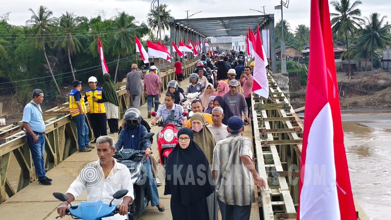 BIREUN | BIDIK-KASUSNEWS.COM – Jembatan Bailey di Kutablang yang berada pada jalur nasional Medan–Banda Aceh, Kabupaten Bireuen, Provinsi Aceh, telah rampung dikerjakan dan dinyatakan siap difungsikan mulai Sabtu, 27 Desember 2025. Jembatan darurat tersebut diresmikan melalui prosesi adat peusijuk sebagai simbol doa dan harapan agar jembatan dapat memberikan manfaat serta keselamatan bagi seluruh pengguna jalan. Pembangunan jembatan ini dilaksanakan oleh PT Adhi Karya (Persero) dengan dukungan kontraktor lokal PT Krueng Meuh. Selama proses pengerjaan, proyek tersebut mendapatkan pendampingan dari Pemerintah Aceh melalui Dinas Pekerjaan Umum dan Penataan Ruang (PUPR) serta Balai Pelaksanaan Jalan Nasional (BPJN). Selain itu, percepatan pemasangan konstruksi jembatan turut didukung oleh personel TNI dari Satuan Zeni Kodam Iskandar Muda yang terlibat langsung di lapangan. Setelah prosesi peusijuk yang dilaksanakan oleh tokoh agama setempat pada pukul 08.00 WIB. Usai prosesi tersebut, kendaraan roda dua maupun roda empat sudah dapat melintas, sehingga arus lalu lintas di jalur nasional tersebut kembali berjalan normal. Penyelesaian pembangunan Jembatan Bailey Kutablang dapat dilakukan dalam waktu relatif singkat berkat solidnya kerja sama seluruh unsur yang terlibat. Personel Zeni Kodam Iskandar Muda bersama tim teknis dari instansi terkait dan pihak kontraktor bekerja secara intensif, bahkan berlangsung siang dan malam, demi memastikan jembatan dapat segera difungsikan dan memenuhi standar keamanan. Jembatan Bailey Kutablang dibangun sebagai pengganti sementara Jembatan yang sebelumnya mengalami kerusakan berat dan terputus akibat bencana banjir bandang disertai tanah longsor. Kerusakan tersebut menyebabkan terhentinya akses transportasi pada jalur utama yang menghubungkan Kabupaten Bireuen dengan Kabupaten Aceh Utara serta Kota Lhokseumawe. Terputusnya akses tersebut sempat melumpuhkan mobilitas masyarakat dan distribusi logistik antarwilayah. Aktivitas ekonomi, perdagangan, serta pelayanan publik turut terganggu, khususnya bagi masyarakat yang menggantungkan mata pencaharian dan aktivitas sehari-hari pada jalur Bireuen–Lhokseumawe sebagai koridor vital transportasi dan perekonomian. Secara teknis, pembangunan jembatan melibatkan sebanyak 33 personel dari Zeni Kodam IM dengan progres pekerjaan telah mencapai 100 persen. Jembatan ini dipasang untuk menutup bentang yang sebelumnya terputus sepanjang sekitar 50 meter. Menggunakan konstruksi Bailey tipe 2–1 dengan 21 petak, jembatan memiliki panjang terpasang sekitar 63 meter dengan material milik PUPR. Jembatan ini dirancang mampu menampung beban hingga 60 ton, sehingga dinilai layak dan aman untuk mendukung lalu lintas kendaraan di jalur nasional tersebut. Dengan rampung dan siap difungsikannya Jembatan Bailey Kutablang, diharapkan konektivitas antarwilayah di pantai utara Aceh kembali pulih, aktivitas masyarakat berjalan lancar, serta roda perekonomian dan distribusi logistik antara Kabupaten Bireuen, Kabupaten Aceh Utara, dan Kota Lhokseumawe dapat kembali bergerak secara optimal. (Gs)