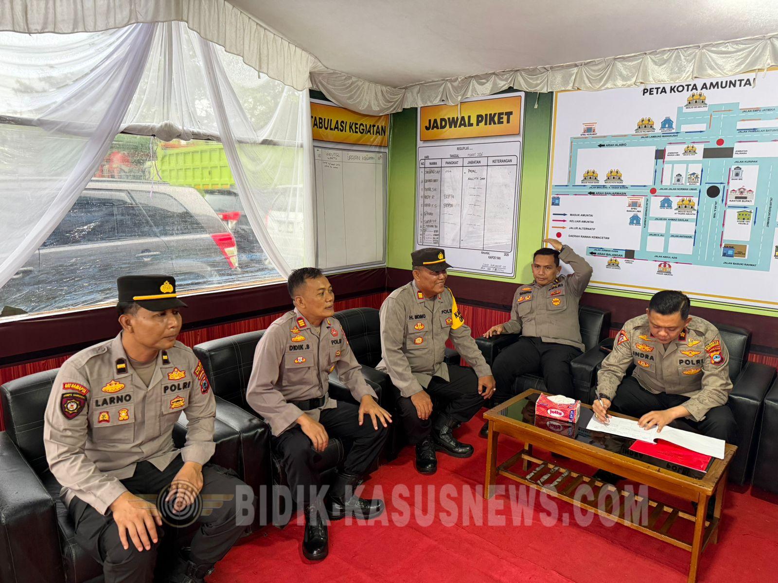 BIDIK-KASUSNEWS.COM Hulu Sungai Utara – Tim Supervisi Direktorat Lalu Lintas Polda Kalimantan Selatan melakukan kunjungan ke Pos Pelayanan (Pos Yan) Operasi Ketupat Intan 2026 di Muara Tapus, wilayah hukum Polres Hulu Sungai Utara, Kamis (19/3/2026). Kegiatan yang berlangsung sejak pukul 12.00 hingga 12.48 WITA tersebut dipimpin oleh Kompol Abd. Rahman, S.H., M.A.P., bersama rombongan sebagai bagian dari pengawasan langsung terhadap kesiapan pengamanan arus mudik Lebaran. Dalam kunjungan tersebut, tim supervisi melakukan pemantauan terhadap kondisi arus lalu lintas, kesiapan personel, serta sarana dan prasarana yang tersedia di Pos Pelayanan. Langkah ini dilakukan guna memastikan pelayanan kepada masyarakat berjalan optimal selama pelaksanaan Operasi Ketupat Intan 2026. Turut hadir dalam kegiatan tersebut Ka Pos Yan AKP Didik Suryanto, S.H., Kasat Lantas Polres HSU IPTU Tri Widodo, S.Pd., Padal IPDA M. Rusdi, S.Sos., serta personel piket Pos Yan dan instansi terkait lainnya. Tim Ditlantas juga menekankan pentingnya kesiapsiagaan personel di lapangan, khususnya dalam mengatur arus lalu lintas serta memberikan pelayanan yang humanis kepada para pemudik. Berdasarkan hasil pemantauan, situasi di Pos Pelayanan Muara Tapus terpantau dalam kondisi aman dan kondusif. Arus lalu lintas di sekitar lokasi juga dilaporkan berjalan lancar tanpa hambatan yang berarti. Kegiatan supervisi ini menjadi bagian dari upaya memastikan pengamanan mudik berjalan efektif, sekaligus menghadirkan rasa aman dan nyaman bagi masyarakat yang melakukan perjalanan selama momen Lebaran. Polres Hulu Sungai Utara menegaskan komitmennya untuk terus meningkatkan kualitas pelayanan serta pengamanan demi mendukung kelancaran arus mudik dan balik Idulfitri 1447 Hijriah. (Agus)