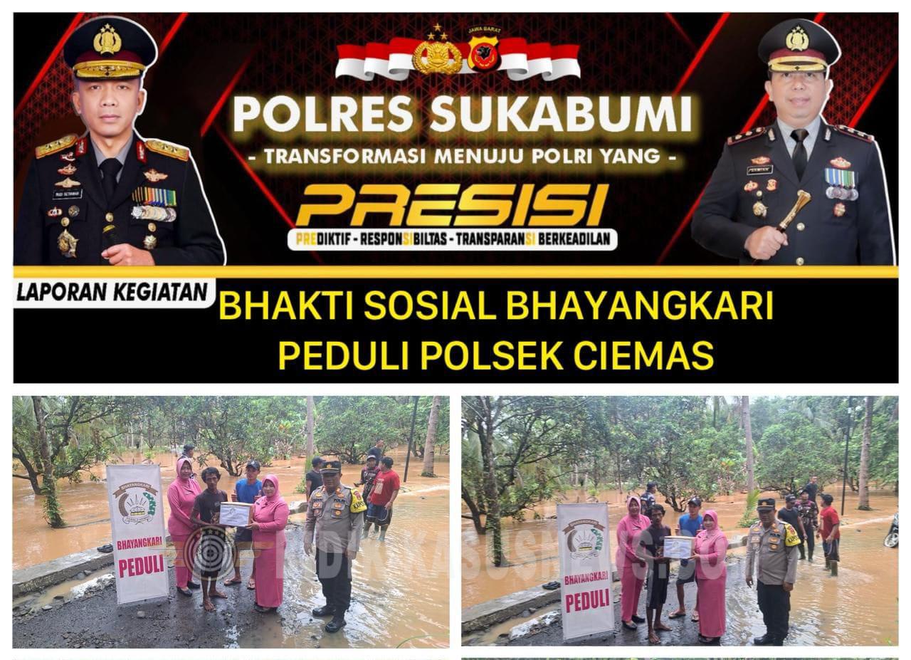 SUKABUMI-BIDIK-KASUSNEWS.COM – Dalam urusan kepedulian sosial terhadap sesama Bhayangkari Ranting Ciemas menjadi yang terdepan. Terlebih bagi korban bencana alam. Salah satunya terhadap warga terdampak bencana di Kampung Kisohir, Desa Mekarsakati, Kecamatan Ciemas, Kabupaten Sukabumi. Kamis (15/1/2026) mereka menyalurkan bantuan paket sembako. Kegiatan bhakti sosial tersebut dilaksanakan sekitar pukul 16.00 WIB hingga selesai, didampingi langsung oleh Pembina Bhayangkari Ranting Ciemas yang juga Kapolsek Ciemas, AKP Deni Miharja, SH., MH., bersama anggota Polsek Ciemas. Penyaluran bantuan difokuskan kepada warga yang terdampak banjir yang melanda wilayah Ranting Ciemas. Paket sembako diberikan sebagai bentuk kehadiran dan empati Bhayangkari dalam meringankan beban masyarakat yang tengah menghadapi dampak bencana alam. Kapolsek Ciemas AKP Deni Miharja menyampaikan bahwa kegiatan tersebut merupakan wujud nyata kepedulian Bhayangkari terhadap kondisi sosial masyarakat, khususnya pada situasi darurat akibat bencana alam. Menurutnya, sinergi antara Bhayangkari dan jajaran kepolisian menjadi bagian dari komitmen Polri untuk selalu hadir di tengah masyarakat. Ia juga menegaskan bahwa kegiatan sosial semacam ini diharapkan dapat memberikan manfaat langsung serta menumbuhkan semangat kebersamaan dan gotong royong antara aparat kepolisian dan warga. Selama kegiatan berlangsung, situasi terpantau aman dan kondusif. Warga penerima bantuan menyambut baik kehadiran Bhayangkari dan jajaran Polsek Ciemas yang secara langsung turun ke lokasi terdampak. Melalui kegiatan bhakti sosial ini, Bhayangkari Ranting Ciemas berharap dapat terus berkontribusi dalam membantu masyarakat, khususnya pada saat menghadapi musibah, sekaligus mempererat hubungan emosional antara Polri dan masyarakat di wilayah Kecamatan Ciemas. (Dicky)