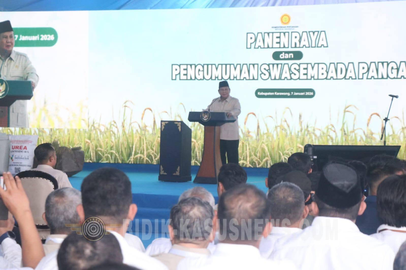 SUKABUMI-BIDIK-KASUSNEWS.COM – Pemerintah Kabupaten Sukabumi menerima penghargaan prestisius dari Presiden Republik Indonesia Prabowo Subianto. Penghargaan level nasional ini diberikan atas dedikasi dan kontribusinya dalam mendukung pencapaian swasembada pangan nasional tahun 2025. Penghargaan tersebut diserahkan dalam rangkaian Panen Raya Nasional yang digelar di halaman Kantor Kecamatan Cilebar, Kabupaten Karawang, Rabu (7/1/2026). Presiden ke delapan tersebut menegaskan, panen raya nasional yang dirangkaikan dengan pemberian satyalencana merupakan penanda keberhasilan Indonesia dalam mewujudkan kembali swasembada pangan. Capaian tersebut, menurut Presiden, merupakan hasil kerja keras seluruh elemen bangsa, khususnya para petani di berbagai daerah. “Bangsa Indonesia harus menjadi bangsa yang sungguh-sungguh waspada, berani mengoreksi diri, dan berani menghadapi keadaan,” ujarnya. Kepala negara juga menekankan bahwa Indonesia memiliki potensi kekayaan alam yang sangat besar. Oleh karena itu, keberhasilan di sektor pangan harus benar-benar dirasakan manfaatnya oleh masyarakat luas. Swasembada pangan dinilai menjadi fondasi penting agar Indonesia dapat tumbuh dan berkembang secara mandiri tanpa ketergantungan pada impor. Sementara itu, Menteri Pertanian Andi Amran Sulaiman menyampaikan bahwa capaian swasembada pangan tidak terlepas dari kebijakan strategis Presiden Prabowo yang berpihak kepada petani. Pemerintah telah menerbitkan 12 Instruksi Presiden dan 25 Peraturan Menteri Pertanian sebagai hasil deregulasi dari lebih 500 aturan sebelumnya. “Hasilnya, harga pupuk berhasil ditekan hingga turun 20 persen. Ini sesuatu yang belum pernah terjadi sejak Indonesia merdeka,” terang Menteri Amran. Di sisi lain, harga gabah naik sehingga berdampak langsung pada peningkatan kesejahteraan petani, tambahnya. Menurutnya, dampak kebijakan tersebut tidak hanya dirasakan di dalam negeri, tetapi juga berpengaruh secara global. Harga pangan dunia tercatat turun dari sekitar 650 dolar AS menjadi 340 dolar AS per ton, atau mengalami penurunan sekitar 44 persen. Ia menambahkan, Indonesia yang sebelumnya dikenal sebagai salah satu importir pangan terbesar kini tidak lagi melakukan impor. Kondisi tersebut membuat pasokan pangan dunia menjadi lebih melimpah, khususnya di negara-negara produsen seperti Vietnam, Thailand, India, dan Pakistan. “Secara tidak langsung, petani dan masyarakat Indonesia telah berkontribusi besar terhadap ketahanan pangan global,” pungkasnya. (Dicky)