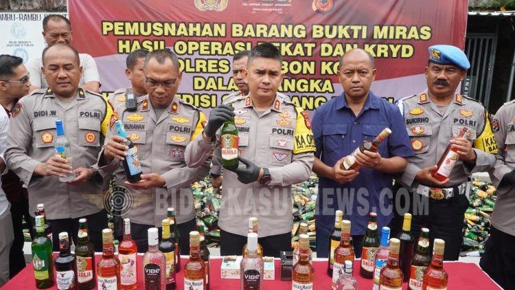Cirebon kota Bidik-kasusnews.com,.Polres Cirebon Kota menunjukkan sikap “zero toleransi” terhadap peredaran minuman keras (miras) jelang Tahun Baru 2026. Sebanyak 3.391 botol miras dari berbagai merek, hasil Operasi Pekat (Penyakit Masyarakat) dan Kegiatan Rutin yang Ditingkatkan (KRYD) sepanjang tahun 2025, dimusnahkan di Mako Polres Cirebon Kota, Rabu (31/12/2025). Aksi ini menjadi bukti komitmen polisi dalam menjaga keamanan dan ketertiban Kota Cirebon. Kapolres Cirebon Kota, AKBP Eko Iskandar, S.H., S.I.K., M.Si, menegaskan bahwa pemusnahan miras ini merupakan langkah konkret untuk menjaga stabilitas keamanan, terutama menjelang pergantian tahun yang rawan gangguan kamtibmas. “Peredaran miras kerap menjadi pemicu tindak kriminal. Kami konsisten melakukan penindakan demi rasa aman masyarakat,” ujarnya. Berbagai jenis miras dari berbagai merek, mulai dari AO, Bir Anker, Anggur Merah, hingga miras oplosan seperti Ciu dan Arak Bali, dilibas habis. Kasat Narkoba Polres Cirebon Kota, AKP Otong Jubaedi, memastikan seluruh barang bukti telah melalui proses hukum sesuai aturan yang berlaku. Lebih dari sekadar pemusnahan, Kapolres mengajak seluruh masyarakat Kota Cirebon untuk menyambut Tahun Baru dengan kegiatan positif dan menghindari perayaan yang berpotensi mengganggu ketertiban. “Mari kita rayakan pergantian tahun dengan sederhana, aman, tertib, dan penuh rasa syukur,” pesannya. Dengan pemusnahan ribuan botol miras ini, Polres Cirebon Kota berharap dapat menekan angka kriminalitas dan menciptakan suasana kondusif bagi masyarakat dalam menyambut Tahun Baru 2026. “Kami tidak akan memberikan ruang bagi peredaran miras ilegal di wilayah hukum Polres Cirebon Kota,” tegas AKP Otong Jubaedi. (Asep.R)