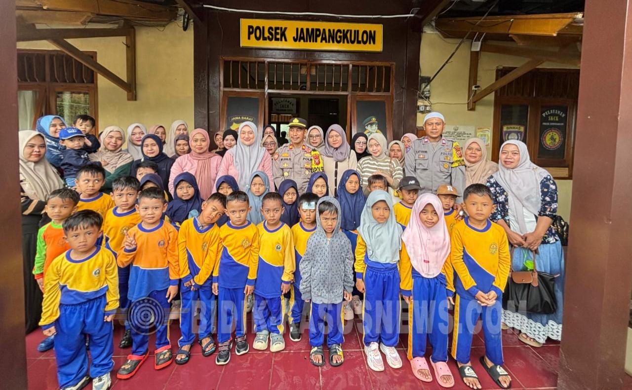 SUKABUMI-BIDIK-KASUSNEWS.COM – Polsek Jampangkulon menerima kunjungan edukatif dari siswa dan siswi TK Sejahtera VIII dalam rangka program Polisi Sahabat Anak, Kamis pagi, 18 Desember 2025. Kegiatan tersebut berlangsung di Mapolsek Jampangkulon, Kecamatan Jampangkulon, Kabupaten Sukabumi. Kunjungan disambut langsung oleh Kapolsek Jampangkulon, Iptu Muhlis, bersama jajaran anggota. Anak-anak dikenalkan secara langsung dengan tugas dan peran kepolisian melalui pendekatan yang ramah, komunikatif, dan menyenangkan. Dalam kegiatan tersebut, personel Polsek memberikan edukasi dasar mengenai tata tertib berlalu lintas, termasuk pengenalan rambu-rambu lalu lintas kepada anak-anak sejak usia dini. Selain itu, para siswa juga diajak berkeliling untuk melihat sejumlah ruangan pelayanan dan fungsi di lingkungan Polsek, seperti ruang KSPKT, ruang tahanan, ruang Reskrim, ruang Intelkam, hingga pengenalan kendaraan mobil patroli. Kapolsek Jampangkulon, Iptu Muhlis, menyampaikan bahwa kegiatan Polisi Sahabat Anak bertujuan menanamkan rasa aman, percaya, dan kedekatan anak-anak terhadap institusi kepolisian sejak dini. “Kami ingin anak-anak tidak takut dengan polisi, tetapi justru mengenal polisi sebagai sahabat yang melindungi dan mengayomi masyarakat,” ujarnya. Kepala TK Sejahtera VIII, Cicu Rahayu, SPd, mengapresiasi kegiatan tersebut karena memberikan pengalaman edukatif yang berharga bagi para siswa di luar lingkungan sekolah. Selama pelaksanaan kegiatan, suasana berlangsung aman, tertib, dan penuh antusiasme dari anak-anak. Kegiatan ini sekaligus menjadi bagian dari upaya Polri dalam membangun kedekatan humanis dengan masyarakat sejak usia dini. (Dicky)