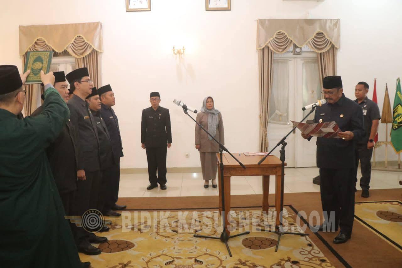 SUKABUMI-BIDIK-KASUSNEWS.COM – Pemerintah Kabupaten Sukabumi melakukan penyegaran pada jajaran pimpinan tinggi pratama dengan melantik empat pejabat eselon IIb di Pendopo Sukabumi, Jumat, 12 Desember 2025. Pelantikan dipimpin langsung oleh Bupati Sukabumi H. Asep Japar. Empat pejabat yang dipercaya menempati posisi baru tersebut yaitu Haerul Imam sebagai Kepala BPKAD, Sri Padmoko sebagai Kepala Dinas Perikanan, Masykur Alawi sebagai Kepala Dinas Kesehatan, dan dr. Asep Suherman sebagai Direktur RSUD Sekarwangi. Keempat pejabat tersebut merupakan hasil seleksi terbuka yang dinilai objektif dan sesuai ketentuan. Dalam arahannya, Bupati Asep Japar menyebut bahwa penugasan ini merupakan bentuk penguatan organisasi agar pelayanan pemerintahan dapat berjalan lebih efektif. Ia mengingatkan agar para pejabat mampu mengelola perangkat daerahnya dengan kepemimpinan yang kuat, cermat, dan berorientasi hasil. Bupati juga menggarisbawahi pentingnya membangun pola kerja yang sehat dan harmonis di lingkungan birokrasi. Ia menilai bahwa sinergi antara pimpinan dan staf menjadi modal penting untuk meningkatkan kualitas pelayanan kepada masyarakat. “Ciptakan lingkungan kerja yang saling mendukung. Ketika kekompakan terjaga, kinerja perangkat daerah akan meningkat,” ujar bupati. Ia menambahkan bahwa pelantikan ini sekaligus mengisi sejumlah posisi yang sempat lowong sehingga jalannya pemerintahan dapat kembali optimal. Bupati menegaskan bahwa pejabat yang dilantik merupakan figur dengan kompetensi terbaik sesuai hasil proses seleksi. Acara ditutup dengan harapan agar pejabat yang baru dikukuhkan dapat menunjukkan dedikasi tinggi serta membawa perubahan positif bagi peningkatan layanan publik di Kabupaten Sukabumi. ( Dicky)