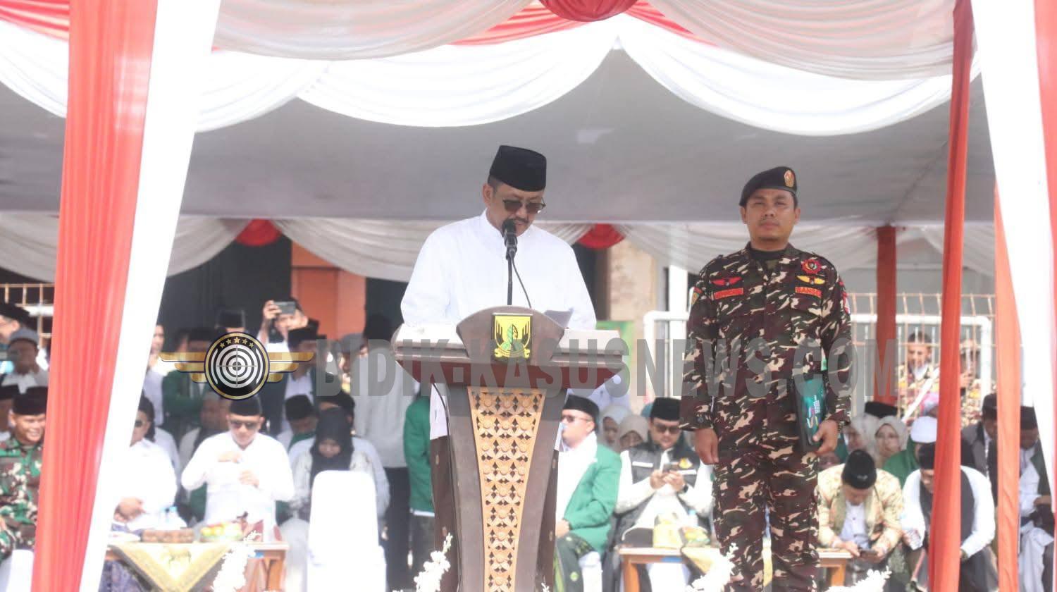 SUKABUMI-BIDIK-KASUSNEWS.COM – Ribuan santri memadati Stadion Korpri Gelanggang Cisaat, Kabupaten Sukabumi, Rabu (22/10/2025), dalam peringatan Hari Santri tingkat Kabupaten Sukabumi. Upacara dipimpin langsung oleh Bupati Sukabumi H. Asep Japar, didampingi Wakil Bupati H. Andreas, serta dihadiri Forkopimda dan para tokoh masyarakat. Dalam amanatnya, H. Asep Japar menegaskan bahwa Hari Santri harus menjadi momentum kebangkitan santri di era modern. Ia menekankan pentingnya penguasaan teknologi, sains, dan bahasa dunia bagi generasi pesantren. “Santri sekarang harus menguasai dunia digital juga. Dunia digital menjadi ladang dakwah baru bagi para santri,” ujarnya. Pada kesempatan sama dia mengajak santri untuk membawa semangat pesantren ke ruang publik, dunia kerja, hingga kancah internasional. “Jadilah santri yang berilmu, berakhlak, dan berdaya. Rawat tradisi pesantren, tapi peluk juga inovasi zaman. Tunjukkan bahwa santri mampu menjadi bagian dari solusi,” tegasnya. Bupati Asep juga mengingatkan, dalam sepuluh tahun sejak ditetapkannya Hari Santri pada 2015, kontribusi pesantren kian nyata di berbagai bidang. Dari lembaga pendidikan inilah lahir banyak tokoh bangsa, pejuang, dan pemimpin yang kini berkiprah di tingkat nasional bahkan internasional. “Santri tidak boleh hanya jadi penonton perubahan zaman. Mereka harus hadir sebagai pelaku sejarah baru yang membawa nilai Islam rahmatan lil’alamin untuk membangun peradaban dunia yang damai dan berkeadaban,” katanya. Di akhir sambutan, H. Asep berharap semangat Hari Santri menjadi dorongan untuk berkolaborasi mewujudkan Kabupaten Sukabumi yang Mubarakah. Sebagai catatan sejarah, penetapan 22 Oktober sebagai Hari Santri merujuk pada Resolusi Jihad KH. Hasyim Asy’ari tahun 1945. Dalam masa itu KH. Hasyim Asy’ari membangkitkan semangat perjuangan rakyat mempertahankan kemerdekaan hingga meletusnya peristiwa 10 November yang kini diperingati sebagai Hari Pahlawan. (Dicky)