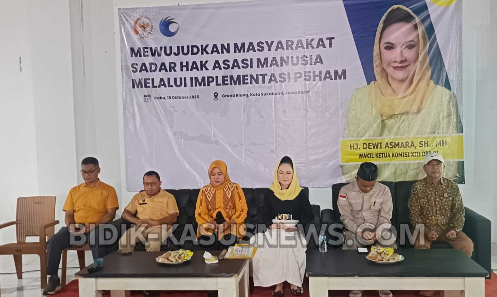 SUKABUMI-BIDIK-KASUSNEWS.COM- Wakil Ketua Komisi XIII DPR RI dari Partai Golkar, Hj. Dewi Asmara, S.H., M.H., menegaskan bahwa visi Asta Cita Prabowo–Gibran menempatkan hak asasi manusia (HAM) bukan sekadar agenda, tetapi fondasi utama pembangunan nasional. Menurut Dewi, arah kebijakan tersebut menunjukkan komitmen kuat pemerintah untuk menghormati, melindungi, dan memajukan hak-hak dasar seluruh warga negara tanpa kecuali. Pernyataan itu disampaikan saat Dewi menjadi pembicara dalam Sosialisasi Program Penghormatan, Perlindungan, Pemenuhan, Penegakan, dan Pemajuan HAM (P5HAM) di Joglo Pasundan, Kota Sukabumi, Kamis (16/10/2025). “HAM adalah hak yang melekat sejak manusia lahir hak hidup, beragama, mendapat pendidikan, layanan kesehatan, dan kehidupan yang layak,” tegas Dewi. Politisi senior Partai Golkar ini menekankan bahwa pelaksanaan pembangunan nasional harus berlandaskan nilai kemanusiaan yang adil dan beradab sebagaimana tertuang dalam Pancasila dan UUD 1945. “Pancasila menjadi pedoman keseimbangan antara hak dan kewajiban. HAM bukan hanya konsep universal, tetapi bagian dari jati diri bangsa Indonesia,” ujarnya. Dalam kesempatan itu, Dewi juga menyoroti pentingnya pendidikan dan literasi HAM sejak dini, termasuk etika dalam bermedia sosial, agar masyarakat tidak mudah terprovokasi oleh informasi yang menyesatkan. “Saring informasi sebelum dibagikan. Hindari ujaran kebencian yang dapat memecah persatuan bangsa,” pesannya. Acara ini turut dihadiri Kakanwil Kemenkumham Jawa Barat Hasbullah Fudhail, Wakil Ketua DPRD Kota Sukabumi Feri Sri Astrina, serta sejumlah tokoh politik daerah seperti Suhud Jaya Kusuma, H. Gundar Kolyubi, dan H. Agus Rukman Mustafa. Hasbullah Fudhail mengapresiasi peran Dewi Asmara dalam memperkuat pengarusutamaan HAM di daerah. “HAM adalah tanggung jawab bersama. Ketika masyarakat memahami dan menghormati hak orang lain, kehidupan berbangsa akan lebih damai dan berkeadilan,” ujarnya. (Usep)
